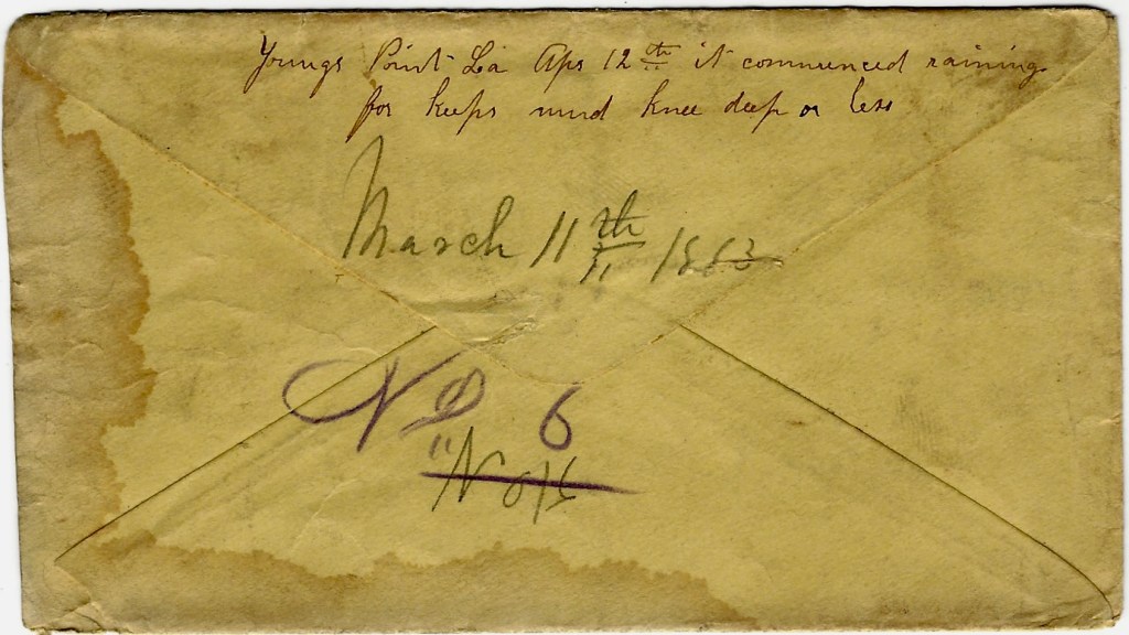 I want you to send me a newspaper pretty soon. We are near the River Tallahatchie and when we got to Wyatt, the Rebels had destroyed the ferry and we had to build a bridge and ten of our company were detailed to cut logs that night from 7 til 9 o’clock. So I claim a share in the great Tallahatchie Poltroon Bridge, for I was one of the ten detailed.