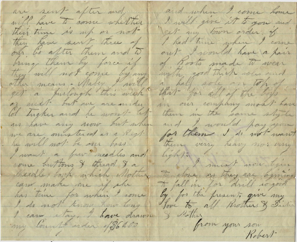 Maybe I will get a furlough this week or next, but we are under Col. Tucker and he won’t let us have any now. But when we are mustered as a regiment, he will not be our boss. I want a few needles and some buttons & thread & a needle book which Mother can make me if she has time, for when I come, I do not know how long I can stay. I have drawn my County order of $60 and when I come home, I will give it to you, and get my town order if I had time when I come out. I would have a pair of boots made to wear with good thick soles and a half sole on top of that for all the boys in our company must have them in the same style and I would pay you for them. I do not want them very heavy, nor very light.