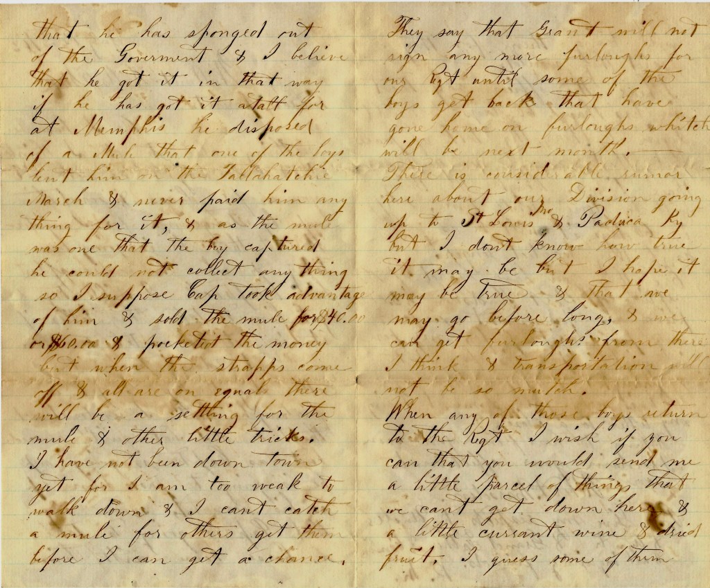 As it is raining and I have nothing to do, I think that I will write a few lines to you and let you know that I am well and in the enemy’s country and we do just about as we want to. There is no guard around camp and the boys take their guns and go and get chickens, sheep, hogs, beef, & honey. They have gone out this morning after something but I don’t know what it is. We also are going to have 5 Negroes to carry our water and cook for us and when we start to travel again, we are going to have some mules confiscated to carry our baggage.