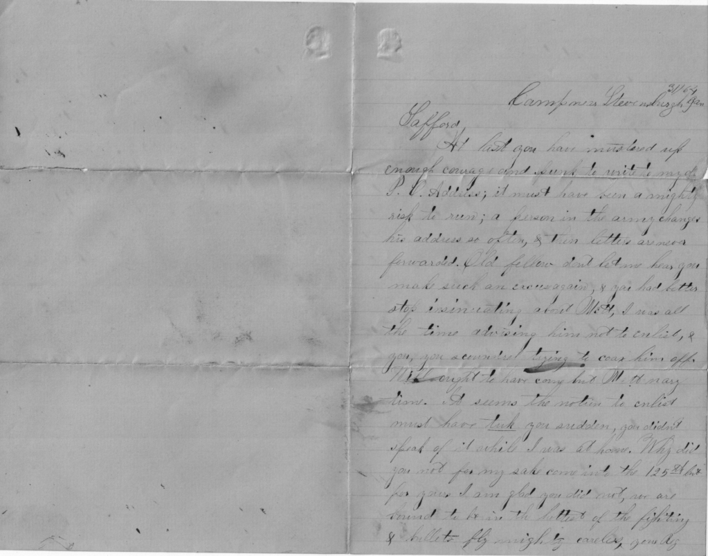 Thursday evening. Well, it is evening and I will now write you a few more lines. I have been made glad this afternoon in receiving a letter from our cousin Marietta at Florence. She writes a capital good letter and I shall answer it soon although I don’t know whether to direct it to Easthampton, Florence, Northampton, or Pugs Hole. Which is it? Won’t you let me know in your next? Ellen, I have had the best cup of coffee tonight that I ever drank. I want you and Jennie to try it and see if it isn’t beautiful. Fill your cup with coffee, then put in a piece of butter about as big as a walnut, then some milk, then break an egg, and put it in. Then sweeten it to your taste. Put in the old crusts and go ahead a drink it down. By jolly, ain’t it good! If eggs weren’t 80 cents a dozen, butter 70 cents a pound, and sugar 18 cents, a soldier even might enjoy himself. But no, it won’t do for them to enjoy themselves. They must be content with salt pork and hard tack. Well, it will all come out right after a while.