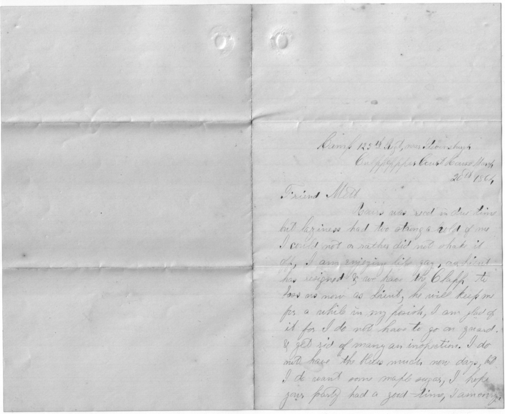 I now seat myself to answer your kind letter that I haven’t received lately. We do not get any mail at all now. Why, I cannot tell. Since writing last, we have moved from Slaughter Mountain and are nearer the rebels by 5 miles than we were then. We left that morning about 9 o’clock and came right here. We expected that the rebels would open a fire upon us, but they did not. We halted in a lot but before we had time to put up our shelter tents, it commenced to rain and you can just believe that it did rain for about an hour. It then slackened and we put up our tents, but we had no more than got them up when it commenced again and it rained hard and steady all night.