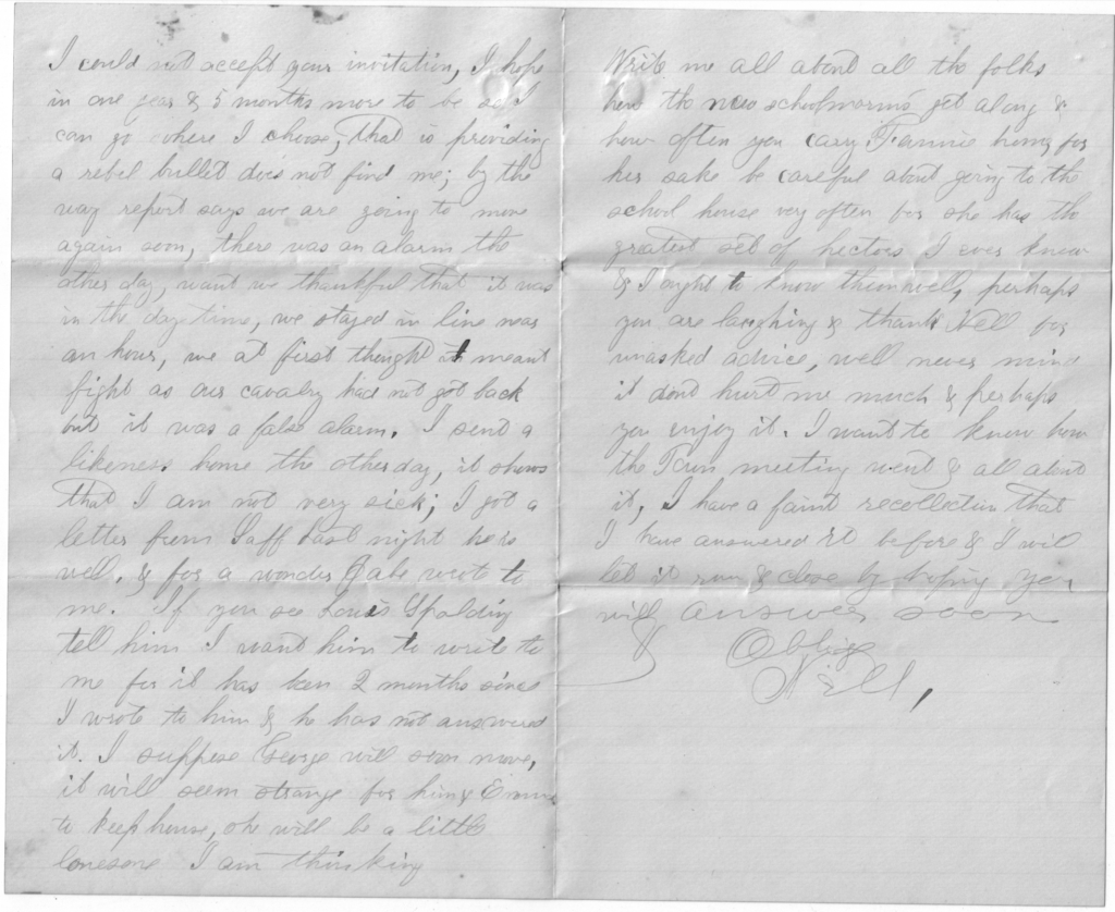 I have heard that Oliver is all right and glad am I to hear of it. Our two men who are missing have been heard from. They are paroled prisoners at Annapolis, Maryland. They were taken prisoners and have been paroled and can no longer fight till they are exchanged. There are seventeen of them that belong to this regiment. Most of the regiment that are here are well. A few are ailing. One has passed away this afternoon. He was a Sergeant. While over the river, he caught a hard cold which resulted in the Typhoid Fever of which he died today. He was an excellent soldier and beloved by his comrades and friends. But he has gone and friends must mourn but not without hope, for he was a devoted Christian. Such are the scenes we pass through on our onward march. God grant that when our turn shall come, we may be prepared to go even if it is on the battlefield.