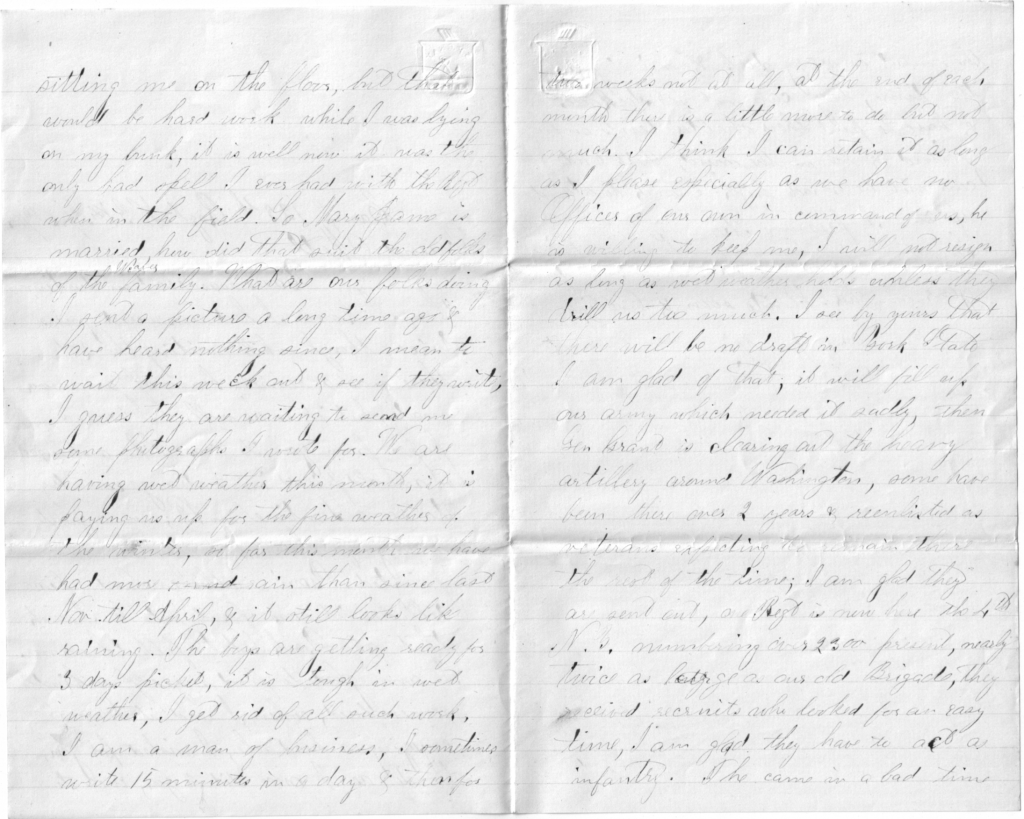 After they were pronounced dead, the Division had to march past them and look at them. They were mangled terribly and I hope never to see another such a sight. The men were young—one of them being 22, the other 18. One of the men was a substitute, and the other—a nice looking young man of 19 who was unable to pay his $300—was drafted and had to come. This is what comes of the [ ] of the North, for if they would have been brave enough to come, there would have been no need of a draft, and no substitutes to hire, and there would have been two men more in the Union army.