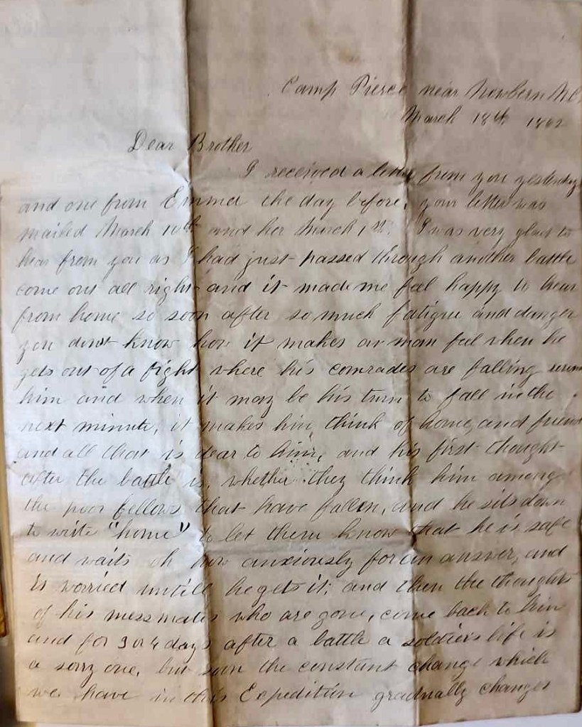 I received a letter from you yesterday and one from Emma the day before. Your letter wsa mailed March 10th and hers March 1st. I was very glad to hear from you as I had just passed through another battle. Come out all right and it made me feel happy to hear from home so soon after so much fatigue and danger. You don’t know how it makes a man feel when he gets out of a fight where his comrades are falling around him and when it may be his turn to fall in the next minute. It makes him think of home and friends and all that is dear to him, and his first thought after the battle is whether they think him among the poor fellows that have fallen, and he sits down to write “home” to let them know that he is safe and waits oh how anxiously for an answer, and is worried until he gets it. And then the thoughts of his messmates who are gone come back to him and for 3 or 4 days after a battle a soldier’s life is a sorry one. But soon the constant change which we have in this Expedition gradually changes his thoughts and he is soon busy thinking of what is going on around him and only when the roll is called and the names of the unfortunate ones are omitted does he for a moment recall the scenes of “the fight” and the many “good times” where the missing ones took part.