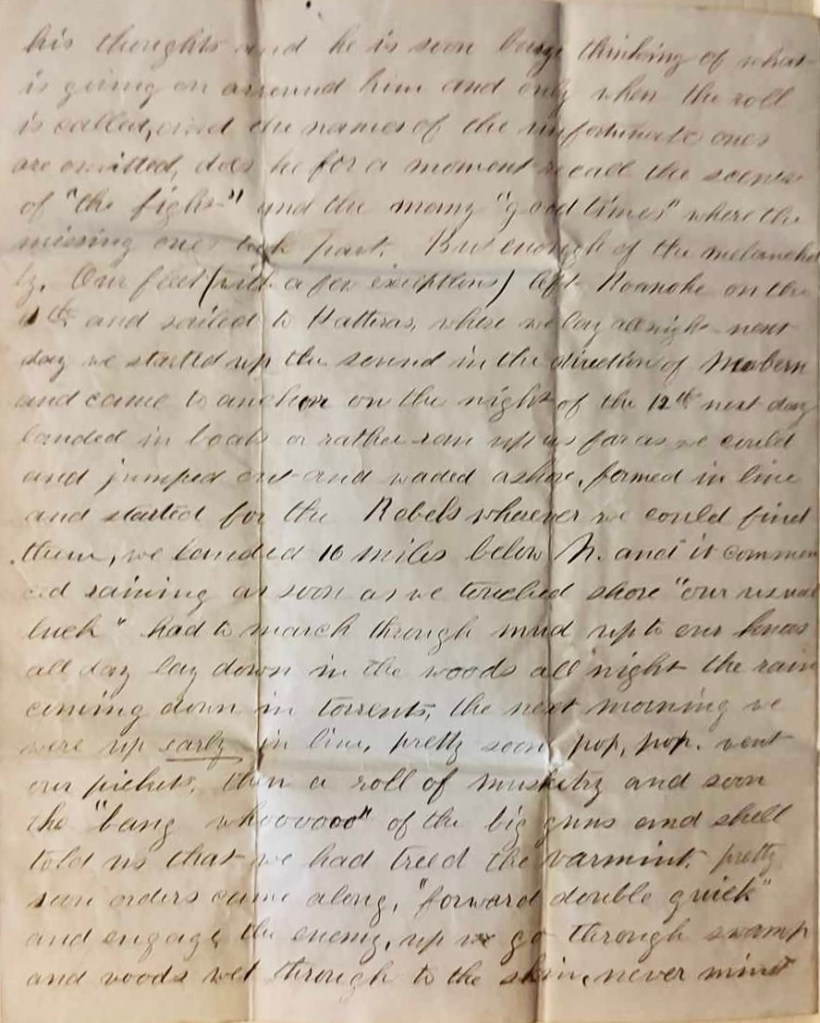 But enough of the melancholy. Our fleet (with a few exceptions) left Roanoke on the 11th and sailed to Hatteras where they lay all night. Next day we started up the sound in the direction of Newbern and came to anchor on the night of the 12th. Next day landed in boats, or rather ran up as far as we could and jumped out and waded ashore, formed in line and started for the Rebels wherever we could find them. We landed 16 miles below Newbern and it commenced raining as soon as we touched shore—“our usual luck.” Had to march through mud up to our knees all day, lay down in the woods all night, the rain coming down in torrents. 1