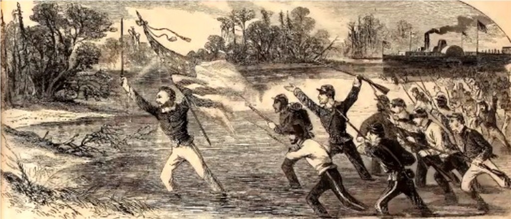 We sailed up Neuse River as far as Slocum’s Creek and anchored for the night. Orders were received to have the guns inspected & everything in order & when we landed to take our overcoats & blankets & leave our knapsacks on the boat & take three days rations. Orders were also given that in landing, strict silence would be insisted on among the men. I arose on the 13th & went on deck & seen the fleet was still anchored in the creek. Early in the morning a tugboat was seen approaching with one of the Generals aides & the boys crowded on deck to catch the order as we supposed he had orders for us. Says he, “Get your men ready with provisions and ammunition for the signals are already up for landing.” It took a good part of the day to land all the troops as we had to go ashore in light draft boats.