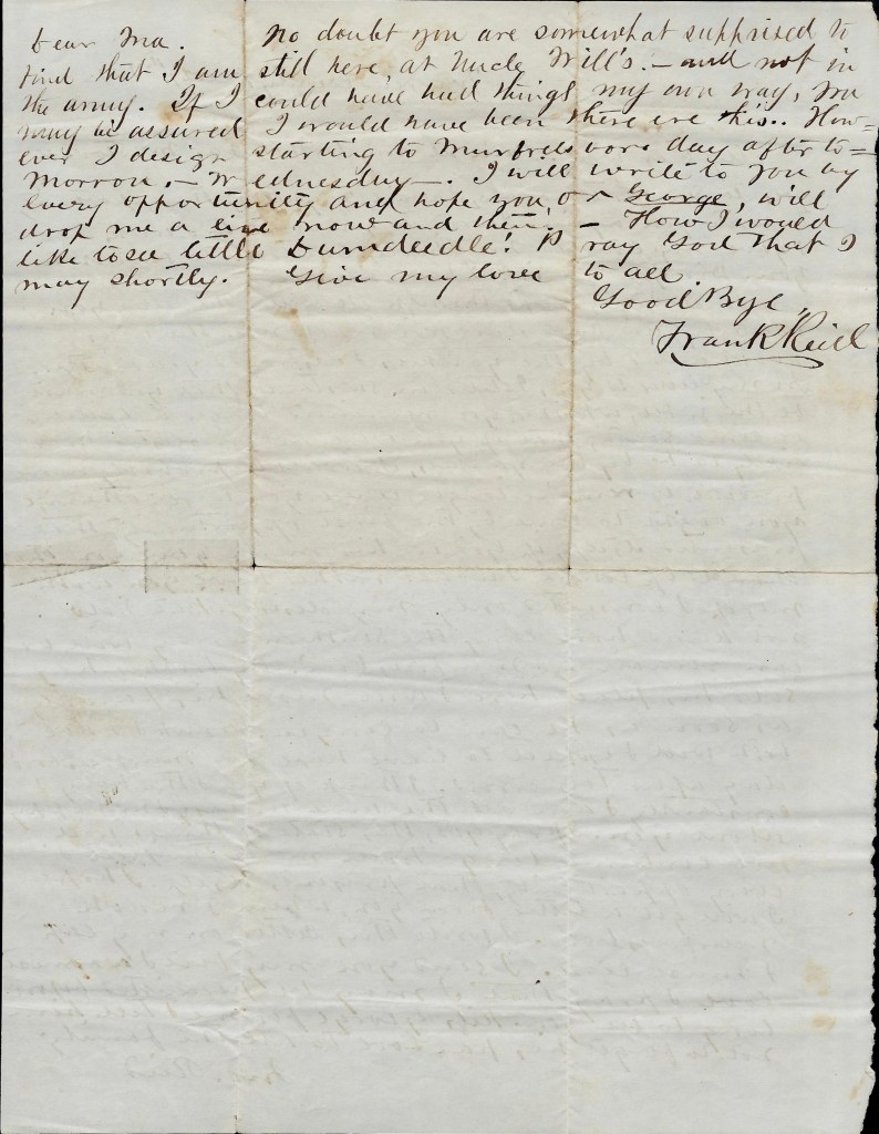 Dear Ma, No doubt you are somewhat surprised to find that I am still here at Uncle Will’s—and not in the army. If I could have had things my own way, you may be assured I would have been there ere this. However, I design starting to Murfreesboro day after tomorrow—Wednesday. I will write to you by every opportunity and hope you or George will drop me a line now and then. How I would like to see little Dumdoodle. I pray God that I may shortly. Give my love to all. Goodbye, — Frank Reid