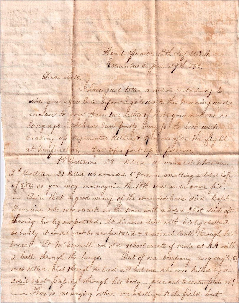 I have just taken a notion (not a drink) to write you a few lines before I go to work this morning and enclose to you those two letters of [brother] Art’s you sent me so long ago. I have been pretty busy for the last week making up Regimental Returns & Records after the fight at Murfreesboro. Our losses foot up as follows.