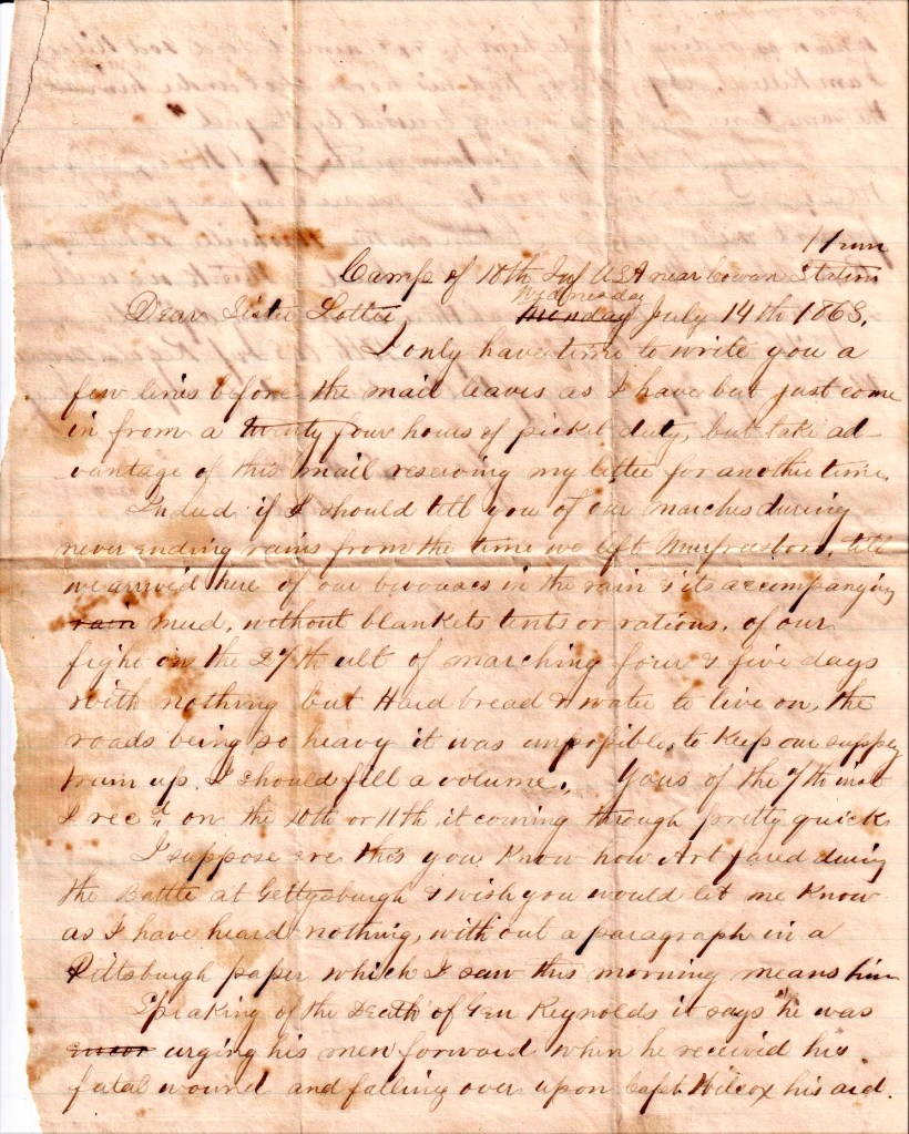 Yours of the 7th inst. I received on the 10th or 11th, it coming through pretty quick. I suppose ere this, you know how Art [Arthur T. Wilcox] fared during the Battle of Gettysburg & wish you would let me know as I have heard nothing without a paragraph in a Pittsburgh paper which I saw this morning. Speaking of the death of Gen. Reynolds, it says “he was urging his men forward when he received his fatal wound and falling over upon Capt. Wilcox—his aide—who was riding beside him, he exclaimed, ‘Good God, Wilcox, I am killed.’ Capt. Wilcox had his horse shot under him about the same time and was severely bruised by the fall.” Was this Art or is there another Capt. Wilcox down there? 1,2