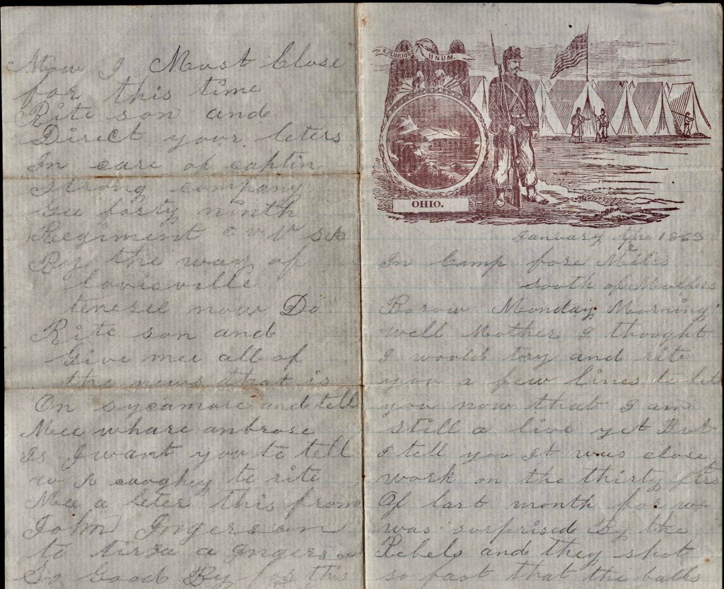 From Austin’s letter we learn that he was not with his company in the Battle of Stones River. He was apparently in Xenia, Ohio, on recruiting duty.