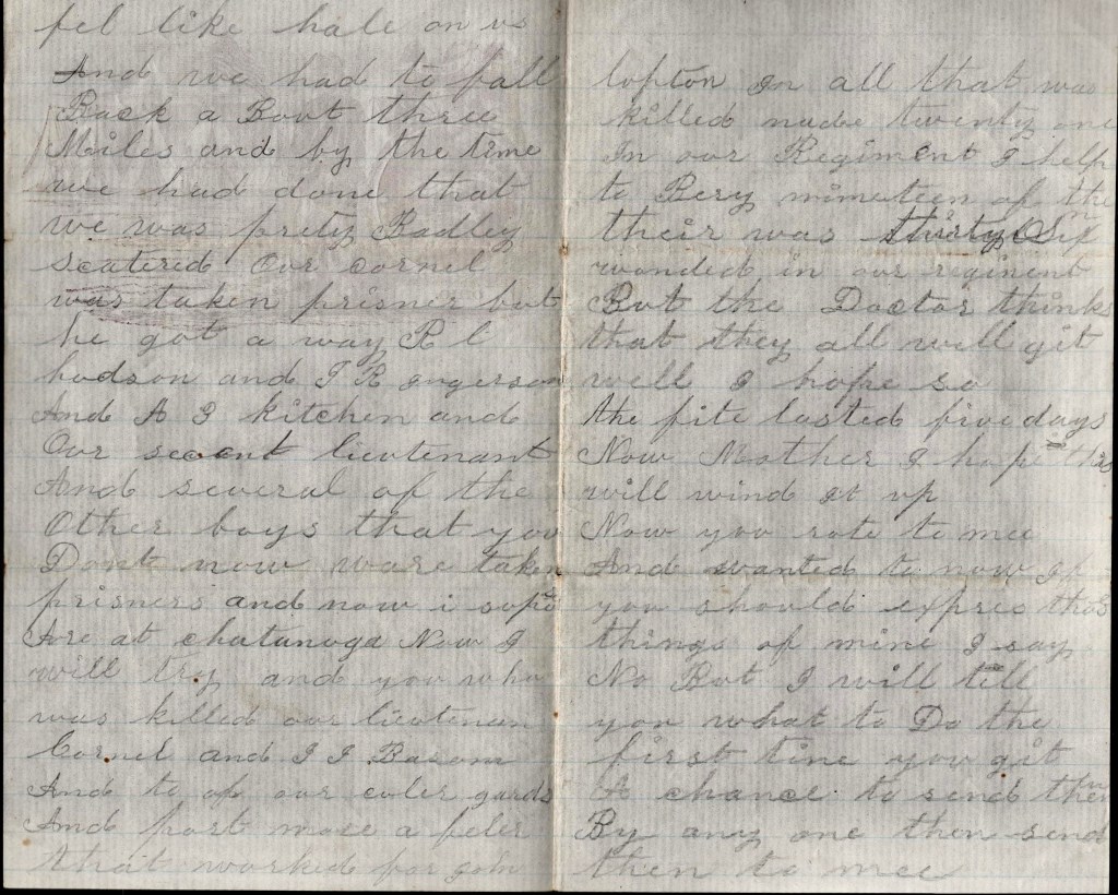 Well, Mother, I thought I would try and write you a few lines to let you know that I am still alive yet but I tell you, it was close work on the 31st of last month for we was surprised by the Rebels and they shot so fast that he balls felt like hail on us and we had to fall back about three miles and by the time we had done that, we was pretty badly scattered. Our colonel was taken prisoner but he got away. R. L. Hudson and J[ames] R. Ingerson and [Amos E.] Kitchen and our 2nd Lieutenant [Isaac H. White] and several of the other boys that you don’t know were taken prisoners and now is supposed are a Chattanooga.