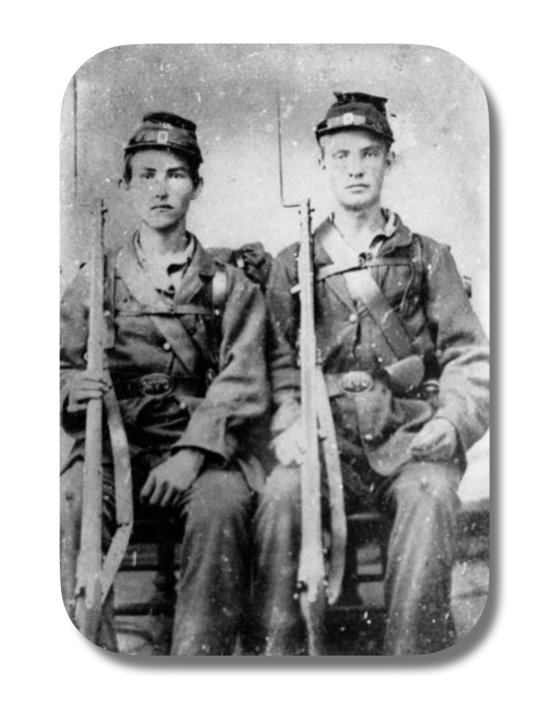 I could not find an image of John but here is a tintype of Winfield “Scott” Stevens (left) and Samuel Oscar Chamberlain (right) who were cousins and served together in Co. E, 49th Ohio Volunteer Infantry (OVI). Scott was wounded in the Battle of Stones River on 31 December 1862 and be discharged in May 1863. Samuel served out his entire term and reenlisted as a veteran.