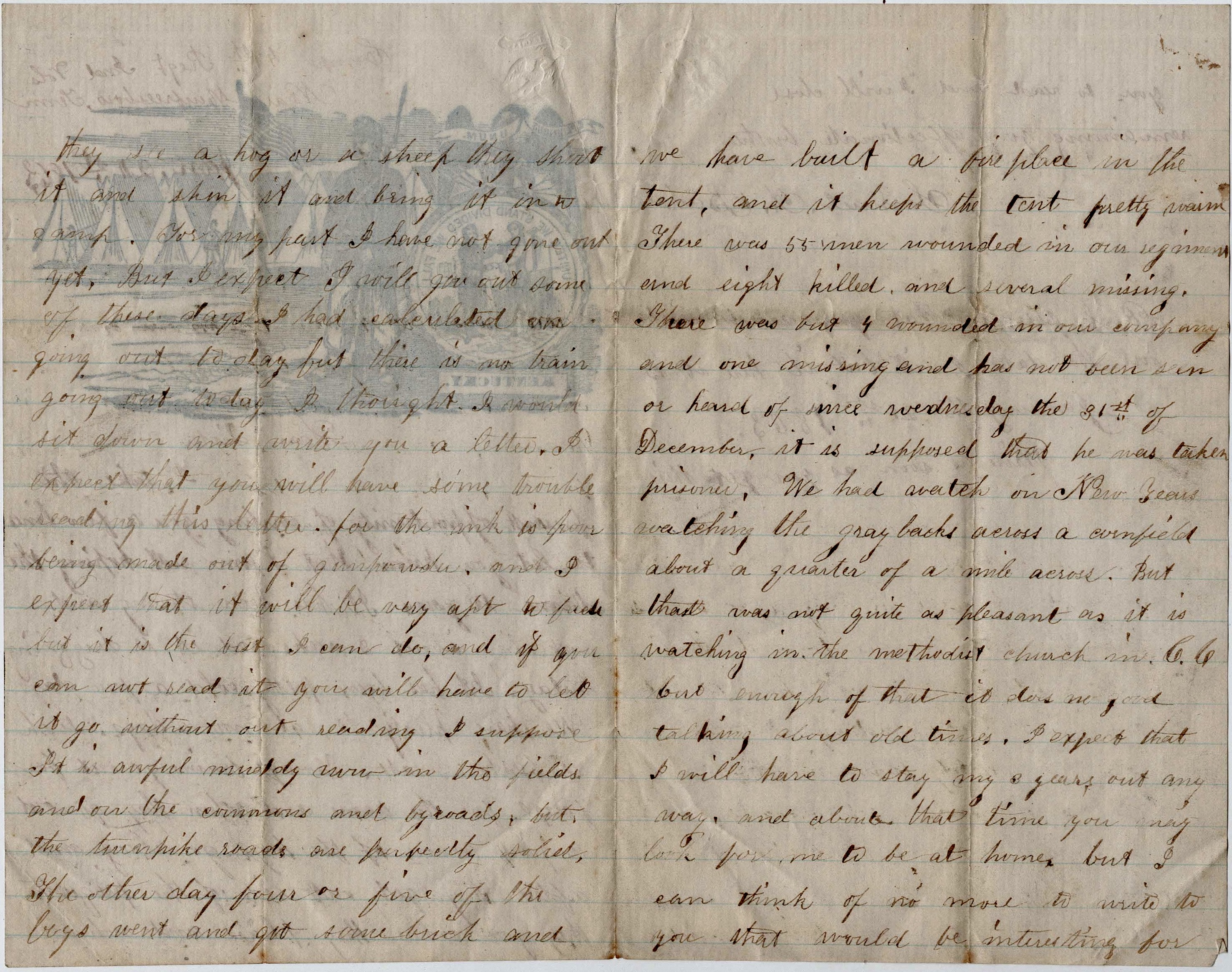 There was 55 men wounded in our regiment and eight killed and several missing. There was but four wounded in our company and one missing and has not been seen or heard of since Wednesday, the 31st of December. It is supposed that he was taken prisoner. We had watch on New Year’s watching the graybacks across a cornfield about a quarter of a mile across. But that was not quite as pleasant as watching in the Methodist church in C. C. [Columbia City]. But enough of that. It does no good talking about old times. I expect that I will have to stay my three years out anyway. And about that time, you may look for me to be at home. But I can think of no more to write to you that would be interesting for you to read. I will close remaining your affectionate brother, — Samuel A. Baker