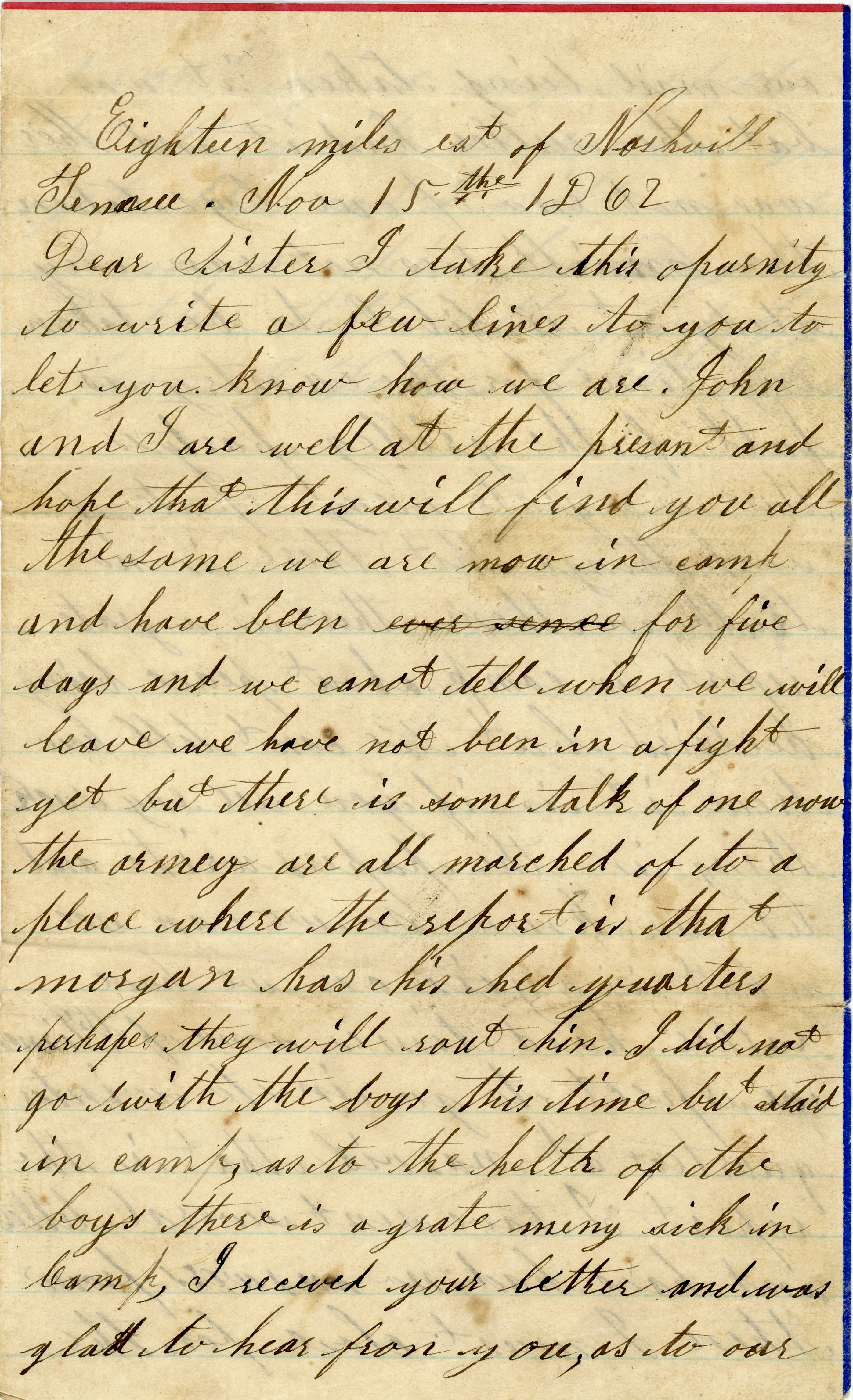 I take this opportunity to write a few lines to you to let you know how we are. [Brother] John and I are well at the present and hope that this will find you all the same. We are now in camp and have been for five days and we cannot tell when we will leave. We have not been in a fight yet but there is some talk of one now. The army are all marched off to a place where the report is that Morgan has his headquarters. Perhaps they will rout him. I did not go with the boys this time but stayed inn camp.