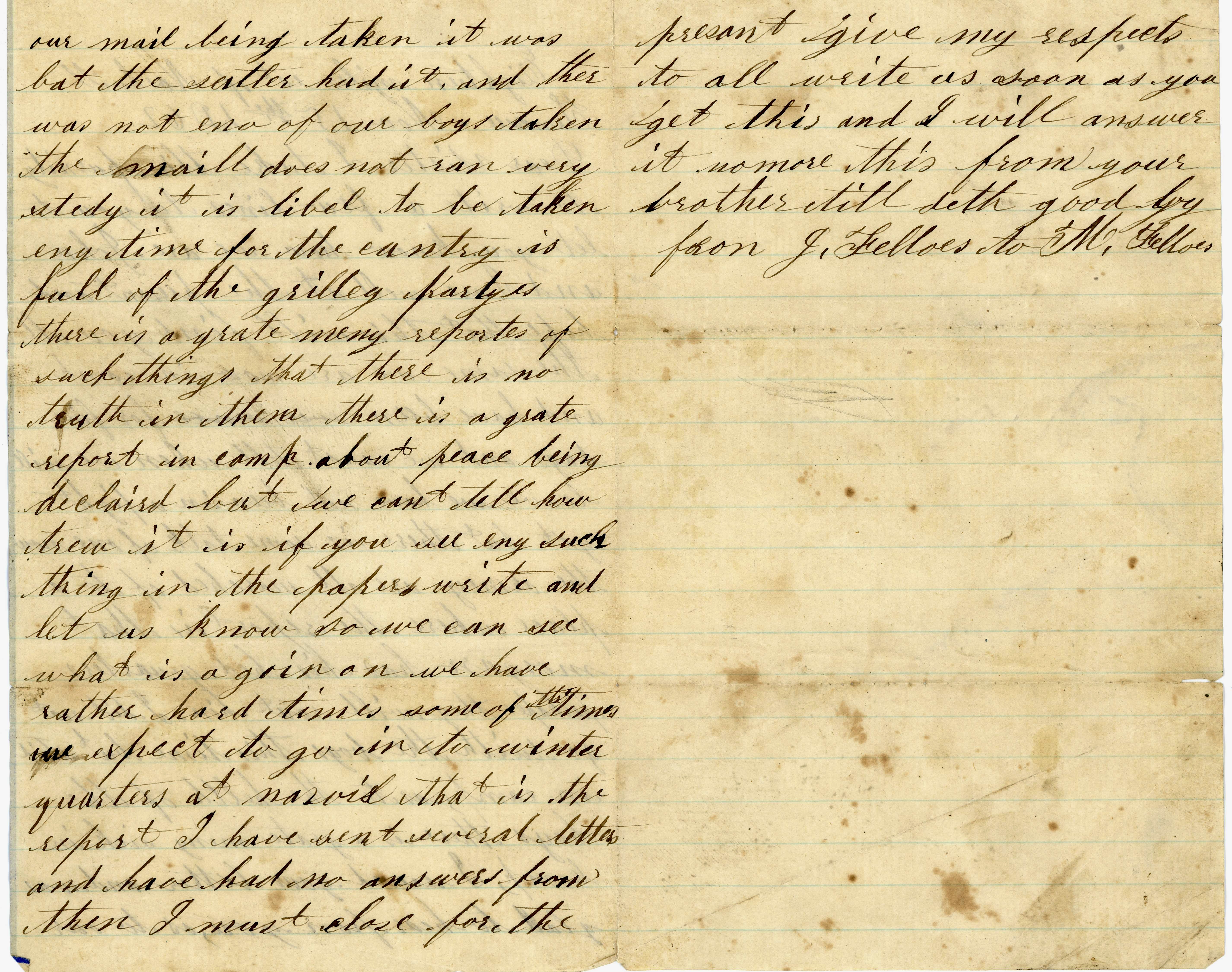 I have sent several letters and have had no answers from them. I must close for the present. Give my respects to all. Write as soon as you get this and I will answer it. No more. This from your brother till death. Goodbye from J. Fellows
