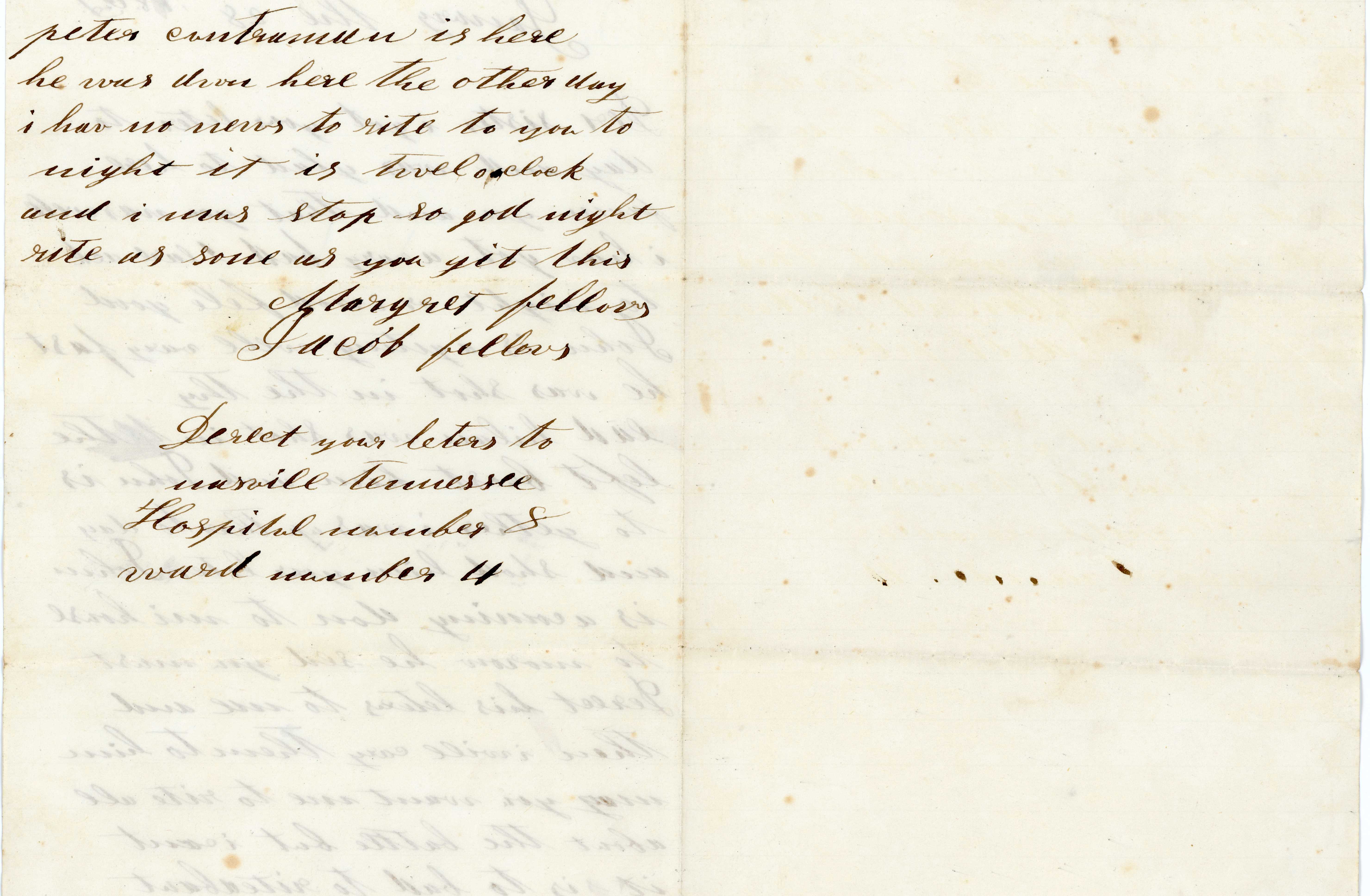Peter Countryman is here. He was down here the other day. I have no news to write to you tonight. It is twelve o’clock and I must stop. So good night. Write as soon as you get this. — Jacob Fellows