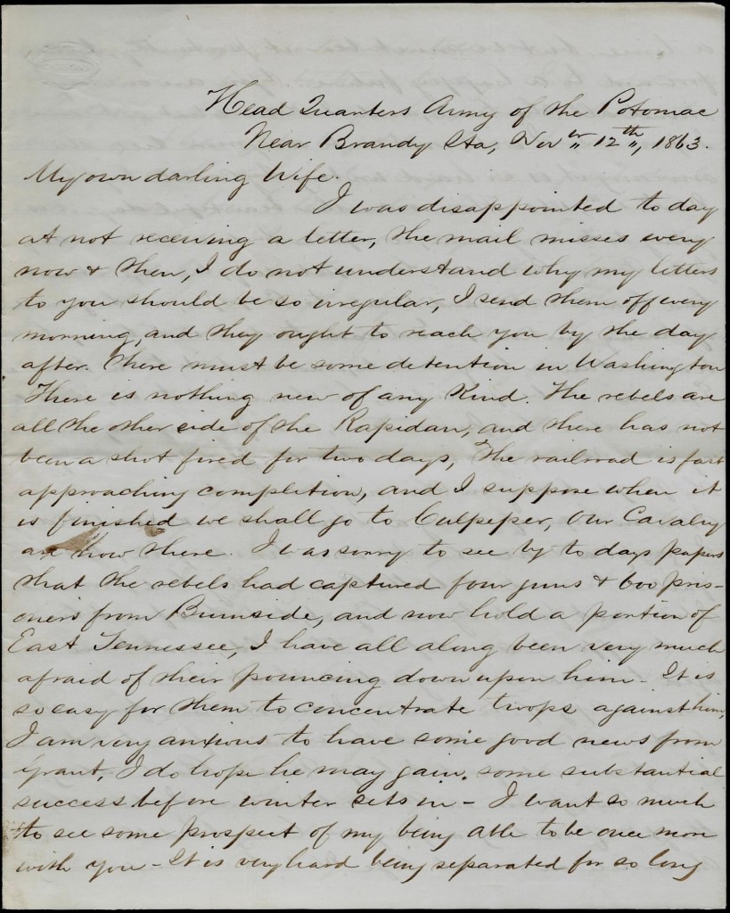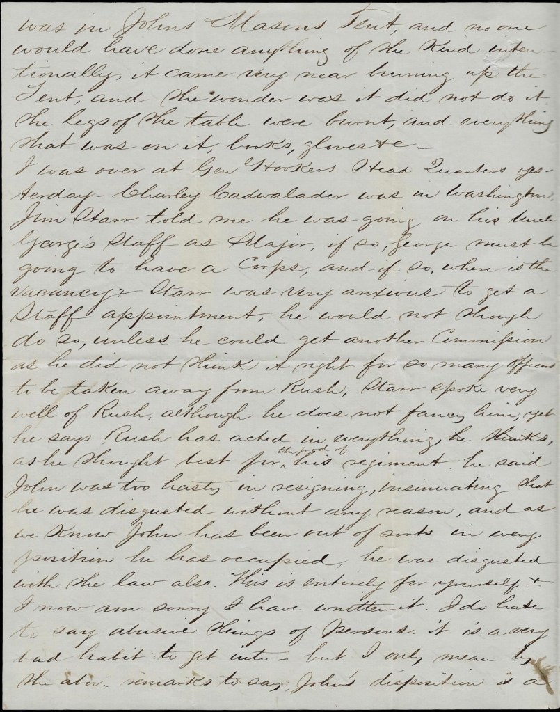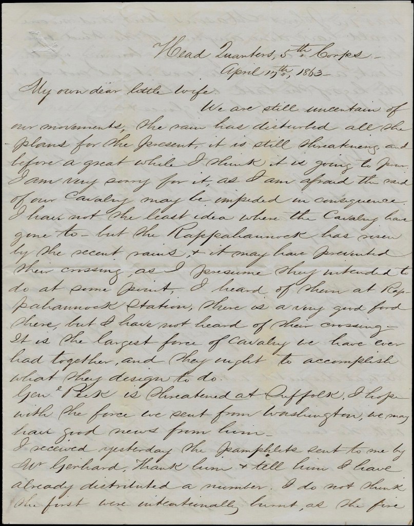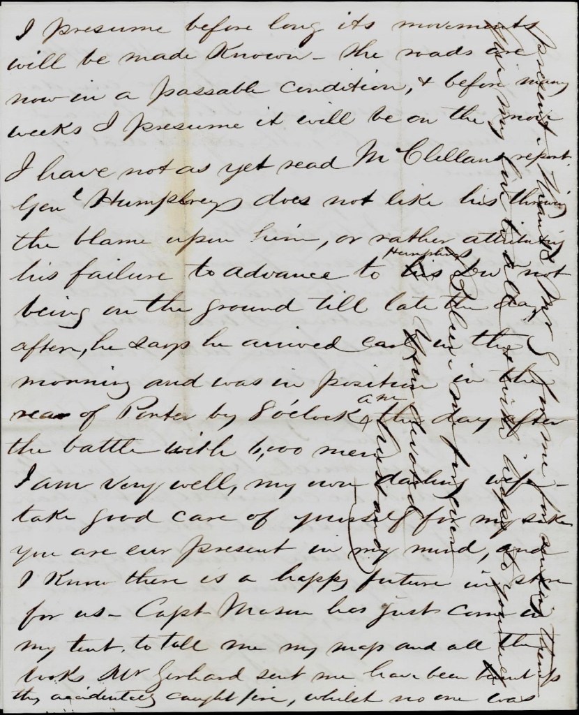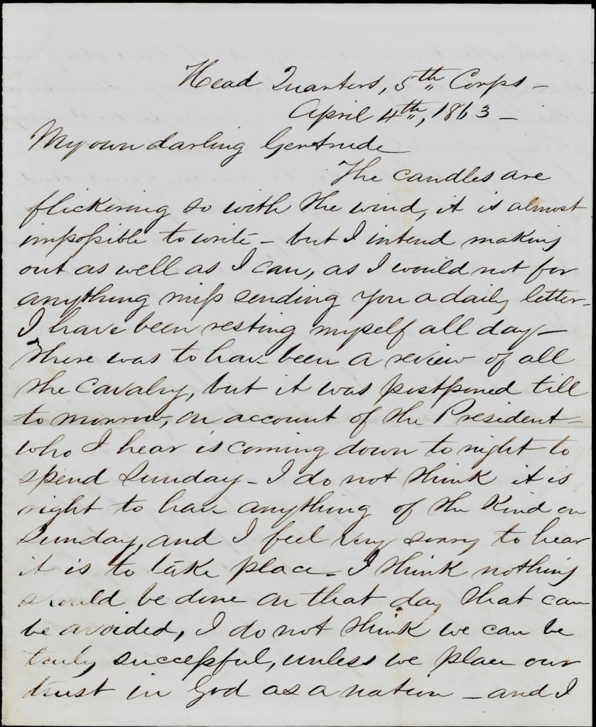 Everything is very quiet today along the line. Merritt is well. Em’s just returned from Fredericksburg where he took a train loaded with wounded.