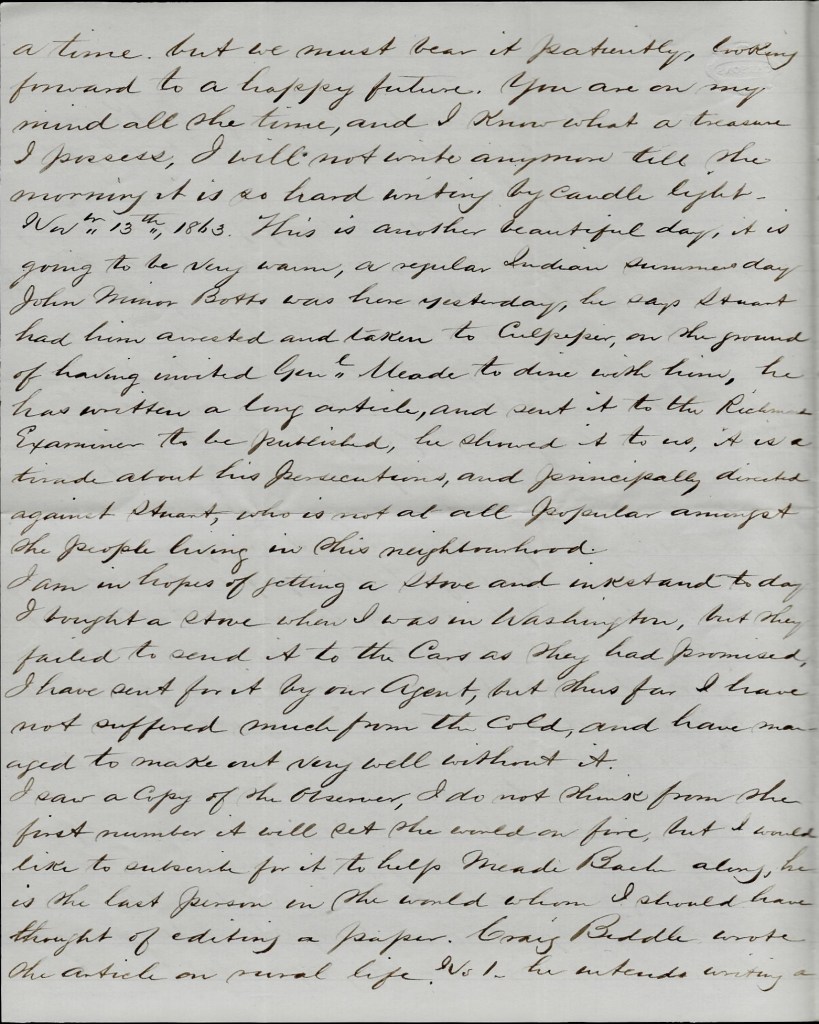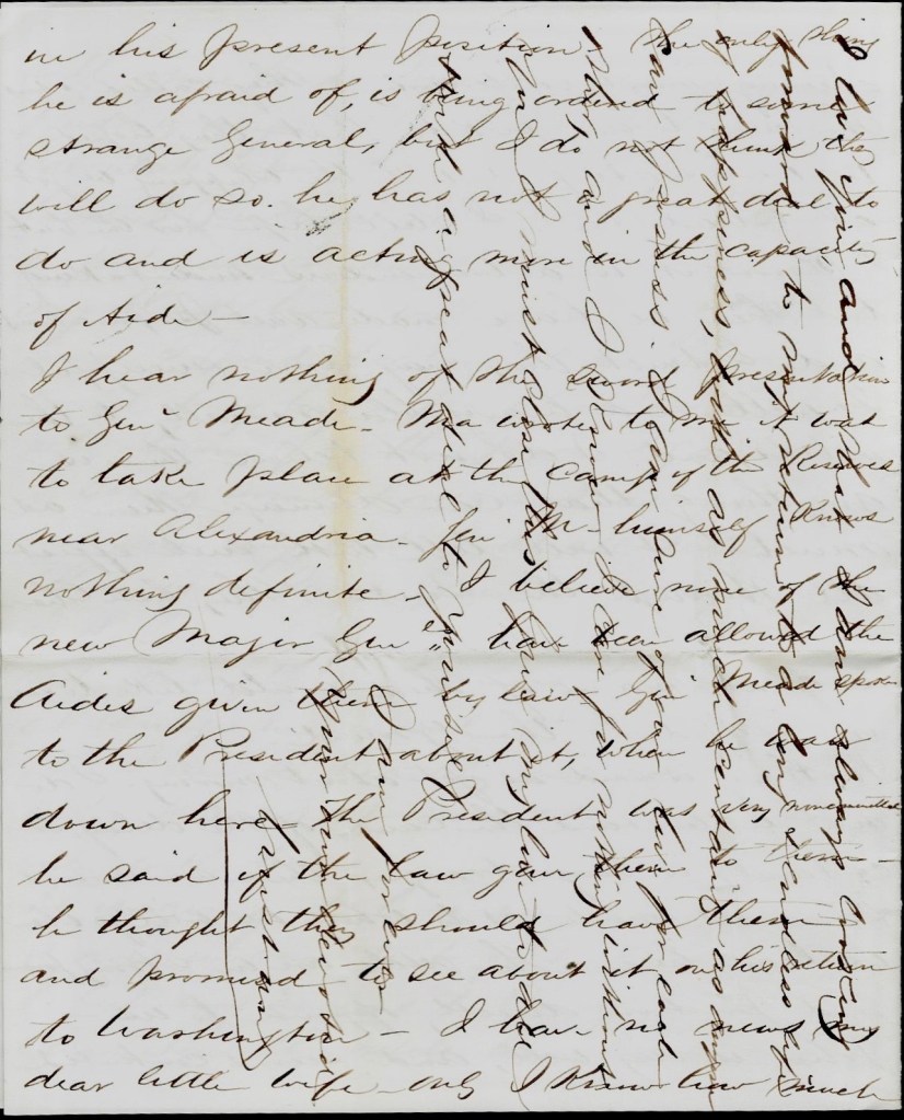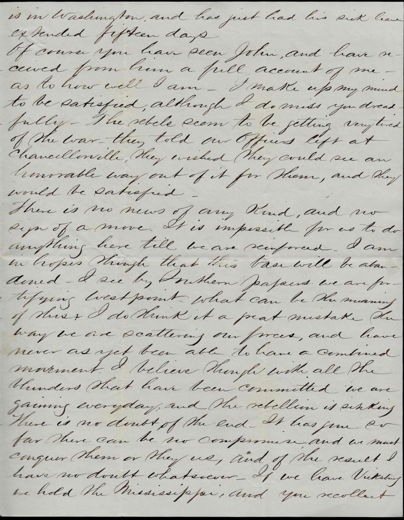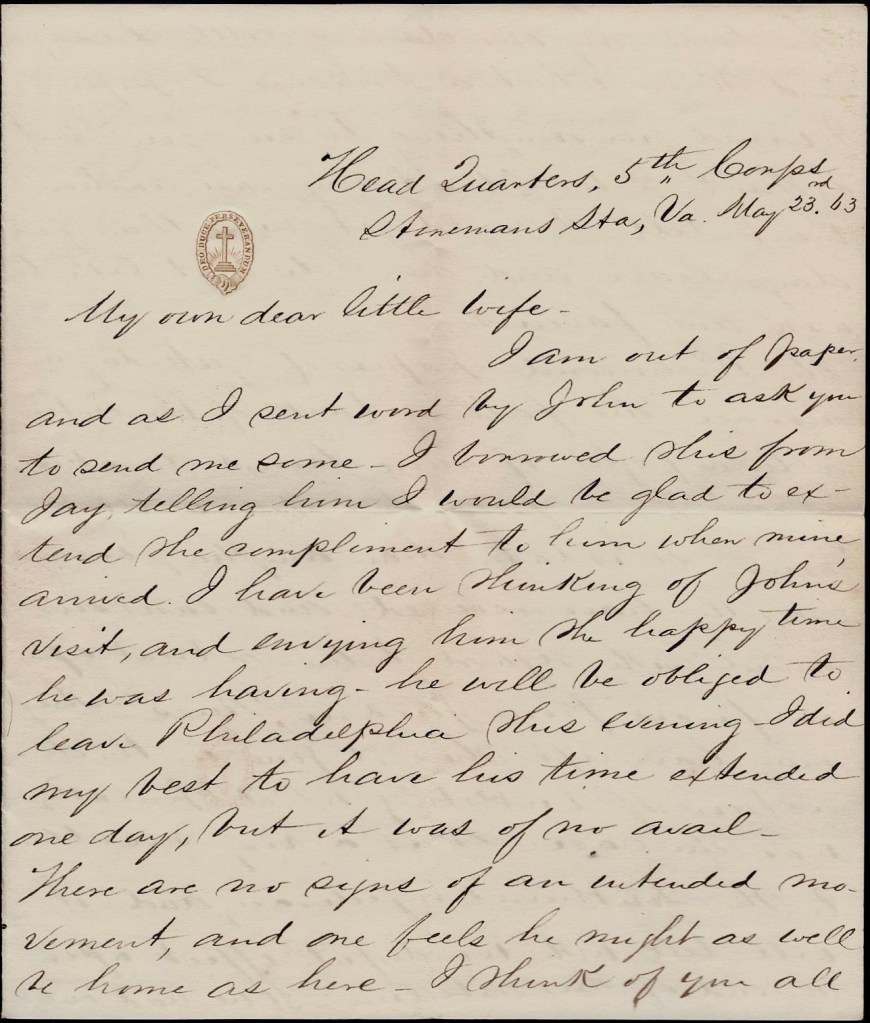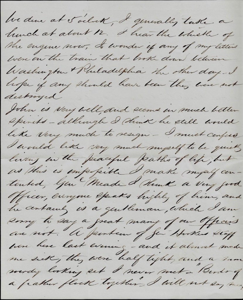 Everything is very quiet today along the line. Merritt is well. Em’s just returned from Fredericksburg where he took a train loaded with wounded.