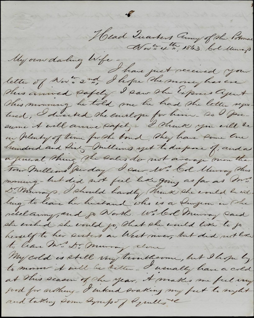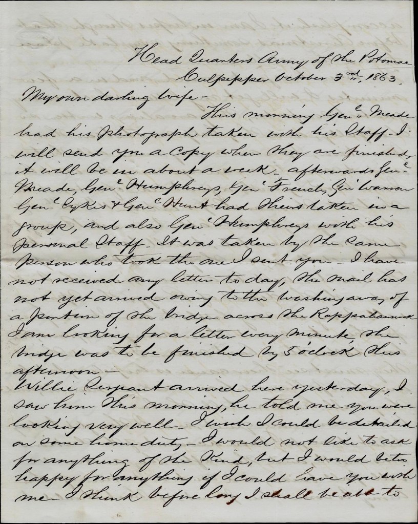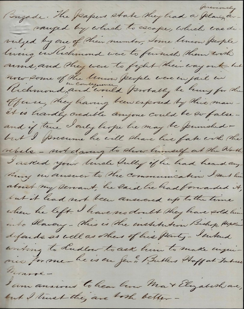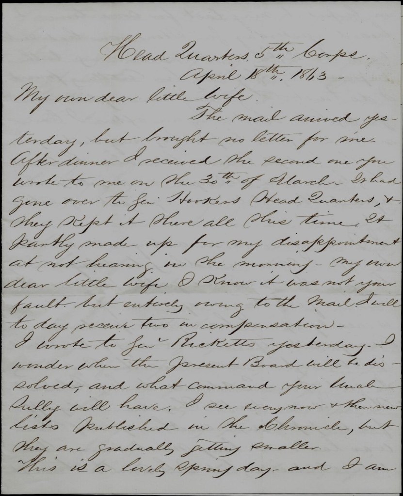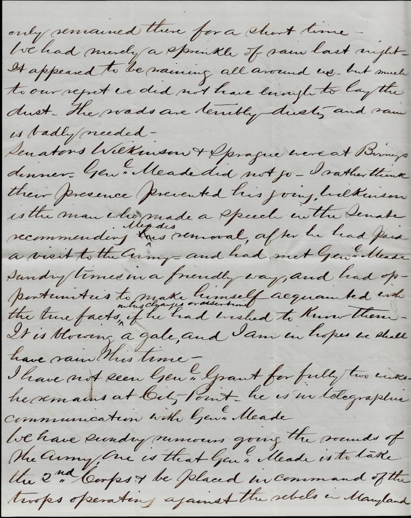 Everything is very quiet today along the line. Merritt is well. Em’s just returned from Fredericksburg where he took a train loaded with wounded.