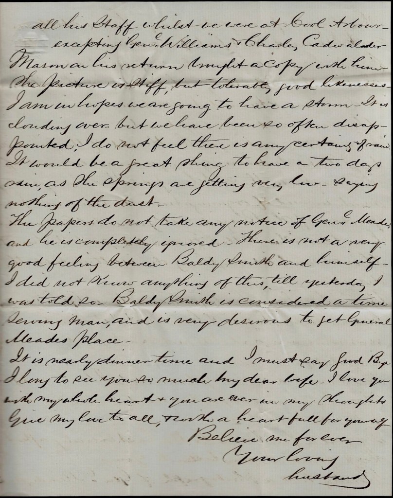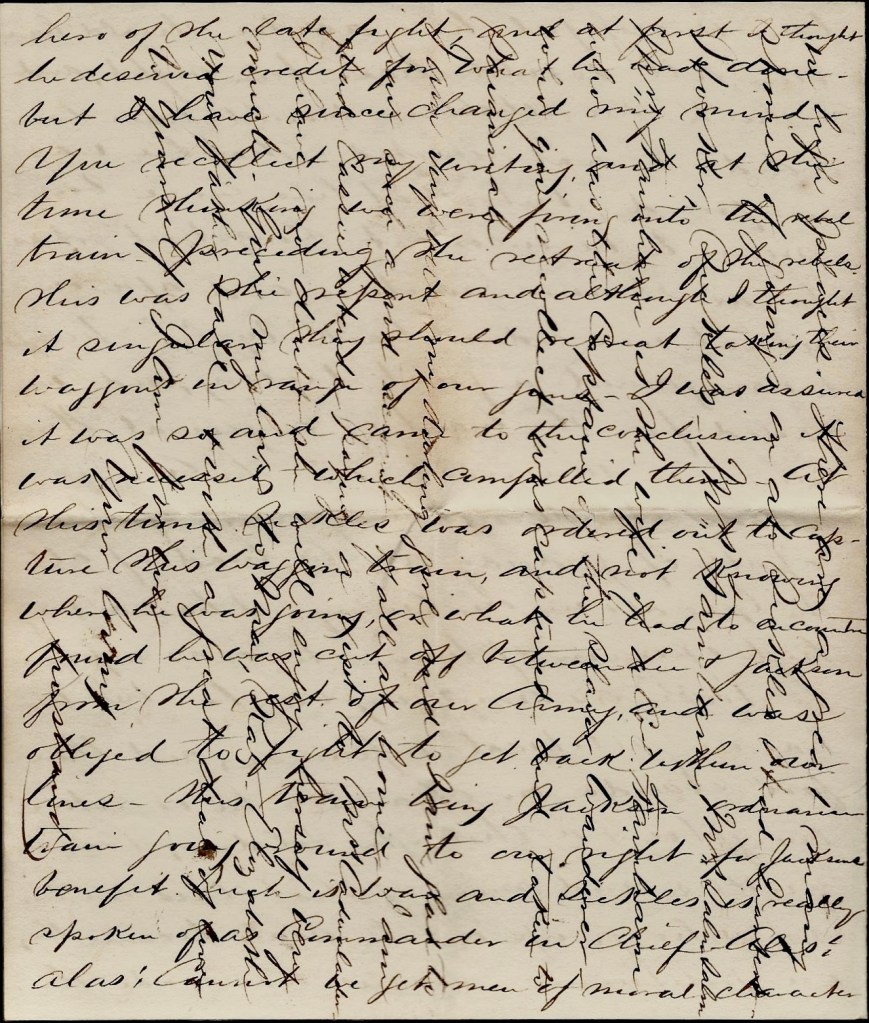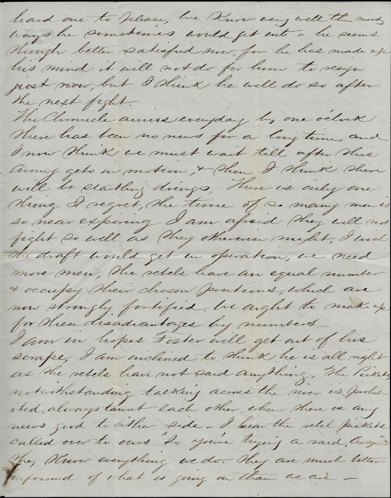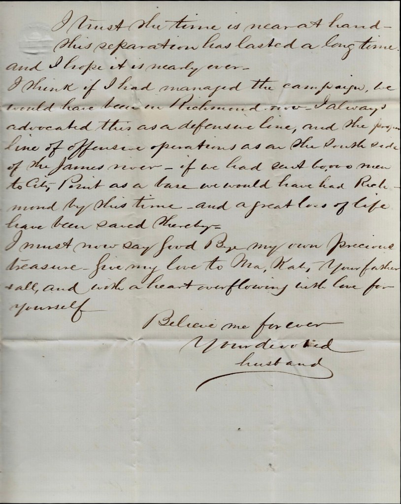 This battle is being very skillfully carried on. Gen. Lee & Gen. Grant are just like two persons playing chess & are a good match for each other. I hope & think we will be victorious in the end. I hope Gen. Butler will be able to take Richmond while Grant holds all Lee’s forces here and fights him. I hope for the best & will [ ] to close this short letter hoping it will get home and also the two I sent before & also one Merritt sent. The last letter I had from home was dated the 3rd of May.
