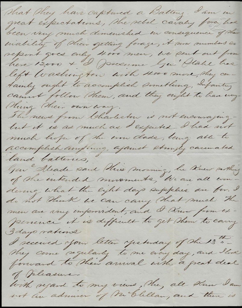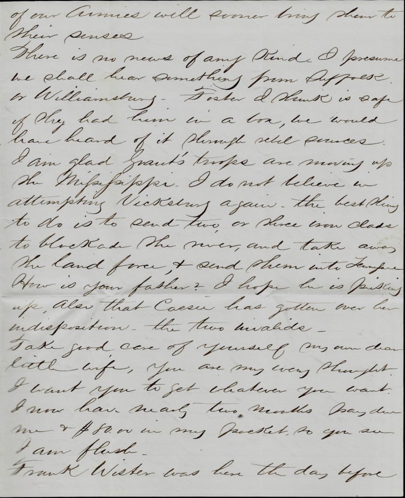 Gen. Grant works on Gen. McClellan’s plan—fortifies every inch as he takes it. The base of supplies I believe is now the White House [Landing]. I received a letter of May 20th. Please give our dear mother bushels of love from Heyward and give the same to Father and Carrie & accept the same for yourself. Please excuse my dirty paper. It dropped in the creek & my hands being dirty helped to soil it.