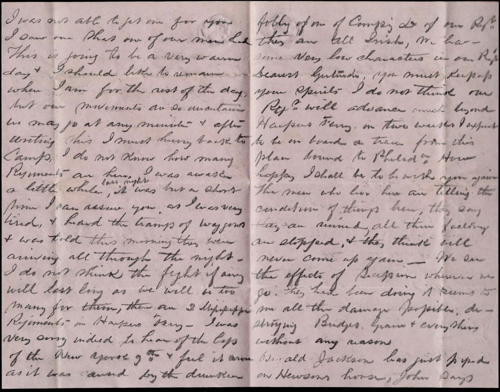 We received the Baltimore Sun of Monday which mentions the evacuation of Harper’s Ferry. They say a good many of them have gone to Edwards Ferry 5 miles from here and that now they have a force there of some 7 or 8,000, but it is not likely they will attempt to cross the river. Neither will we do so if such is the case. This is a horribly dull place & the sooner we get out of it, the better I shall like it.