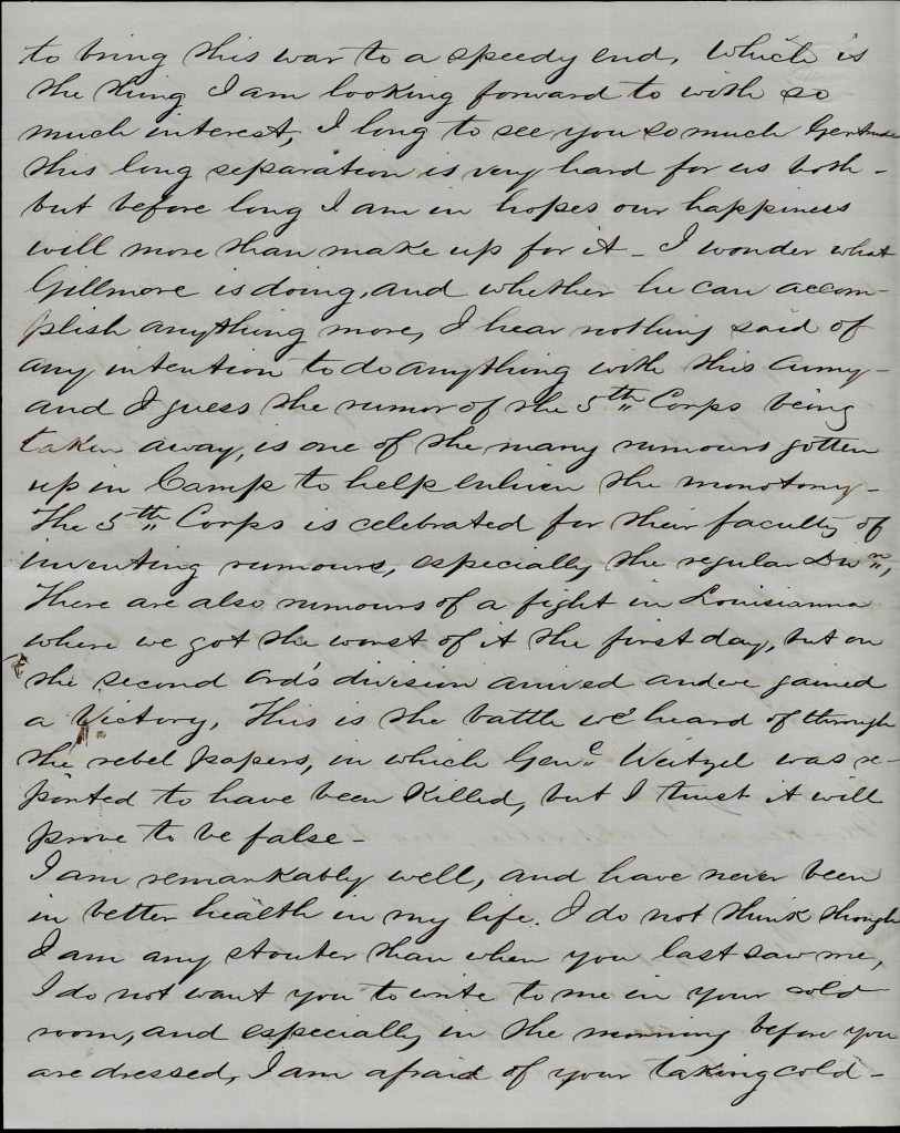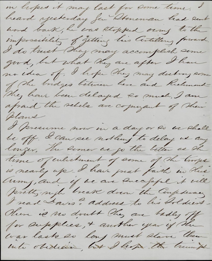 We are now again on the Peninsula about 11 or 12 miles of the long-looked for Rebel capitol. Part of Gen. Butler’s force are here. As I write this, I can hear the skirmishing & cannonading which has not been still for a month nearly now. We have just been in 3 hours from a tiresome march of 14 or 15 [miles] from the extreme right to the very left. I have had my coffee and feel a little refreshed & as it was most two weeks until I wrote on the 29th & I am afraid that letter did not reach home, do Iborrowed paper and made up my mind to write again & send it by the next chance to let all at home know that I am well.