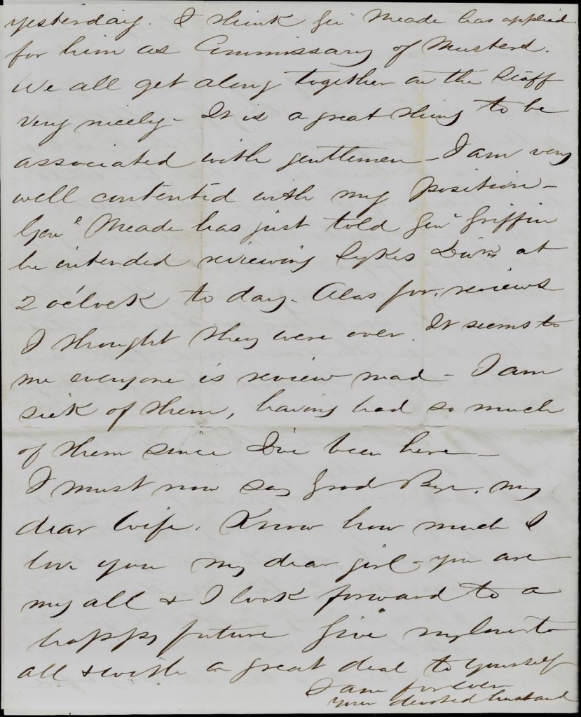 Stephen Bruen is now Quartermaster and Tim Burroughs is Quartermaster Sergeant. Merritt’s [Merritt Bruen] death was very sudden. He had a great many friends in the army.