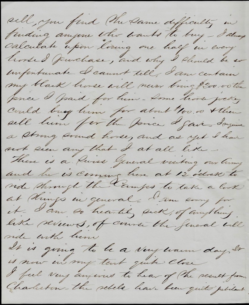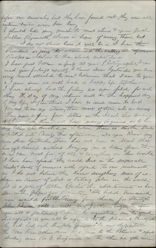 I should like very much to meet Tom’s and your Uncle Sullie’s regiments. I was in hopes of seeing them but now I do not know how it will be. I hear the President is going to recommend the calling out of 500,000 troops in addition to those already enlisted.