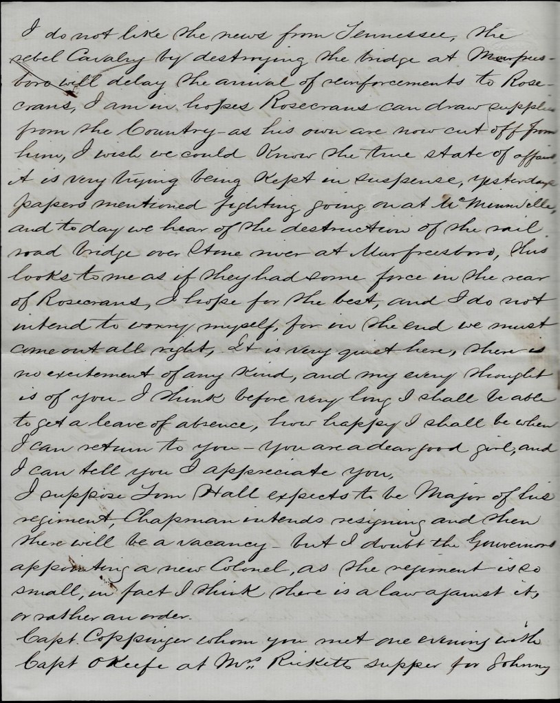 I have just received your letter of the 24th if February. I got the paper day before yesterday but have not got the envelopes yet. I must tell you that we have had two stormy days commencing with rain and rained about 36 hours. Then the snow fell about 4 inches deep. This caused the river to raise and they had to take up the pontoon bridges, thus causing the mail to stop. Perhaps I shall get the envelopes when they put the bridge down. I have not had but one letter in about ten days and that was the one that I got this morning. I am in hopes that I shall have one when the bridge can be crossed. As we get but few papers, I shall not attempt to tell you the war news for I think you know more about the fighting than I do.