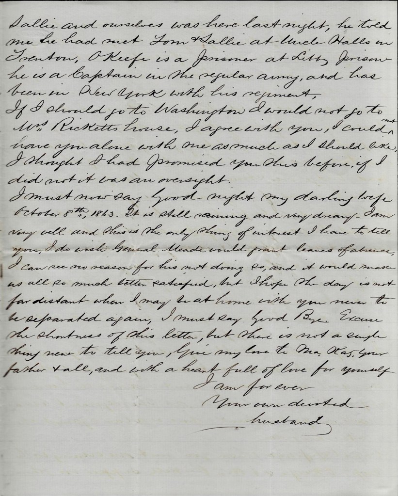 I received sister Kate’s note of the 5th this morning with great pleasure but am sorry to hear that Carrie has so bad a cold. The 5th, 6th, and 8th Regiments have gone home. Next goes the 7th [New Jersey] who are to go between this and October 1st. The clerks are busy making out muster rolls.