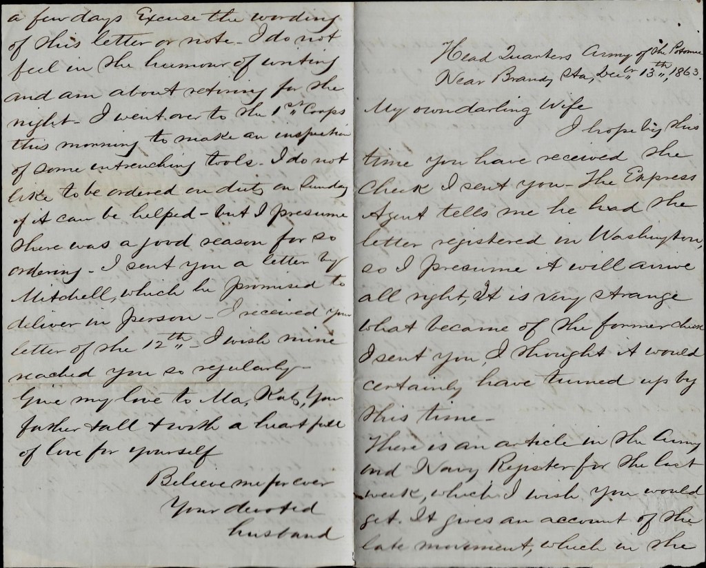 I told you in my last that we were all packed up ready to move. Well we started on a march Saturday night with four days rations. I told you that it snowed the night before, then began to rain. Well, we started about six o’clock in the evening. It was rumored that the 5th Corps was cut off by the rebs and we had got to go and release them but that was not the case. The 5th and 2nd Corps made a dash on the road and we had to go to protect the flanks. Perhaps you do not know what I mean by that. Well, it is to join on to their right and left so that the rebs cannot get in behind them.