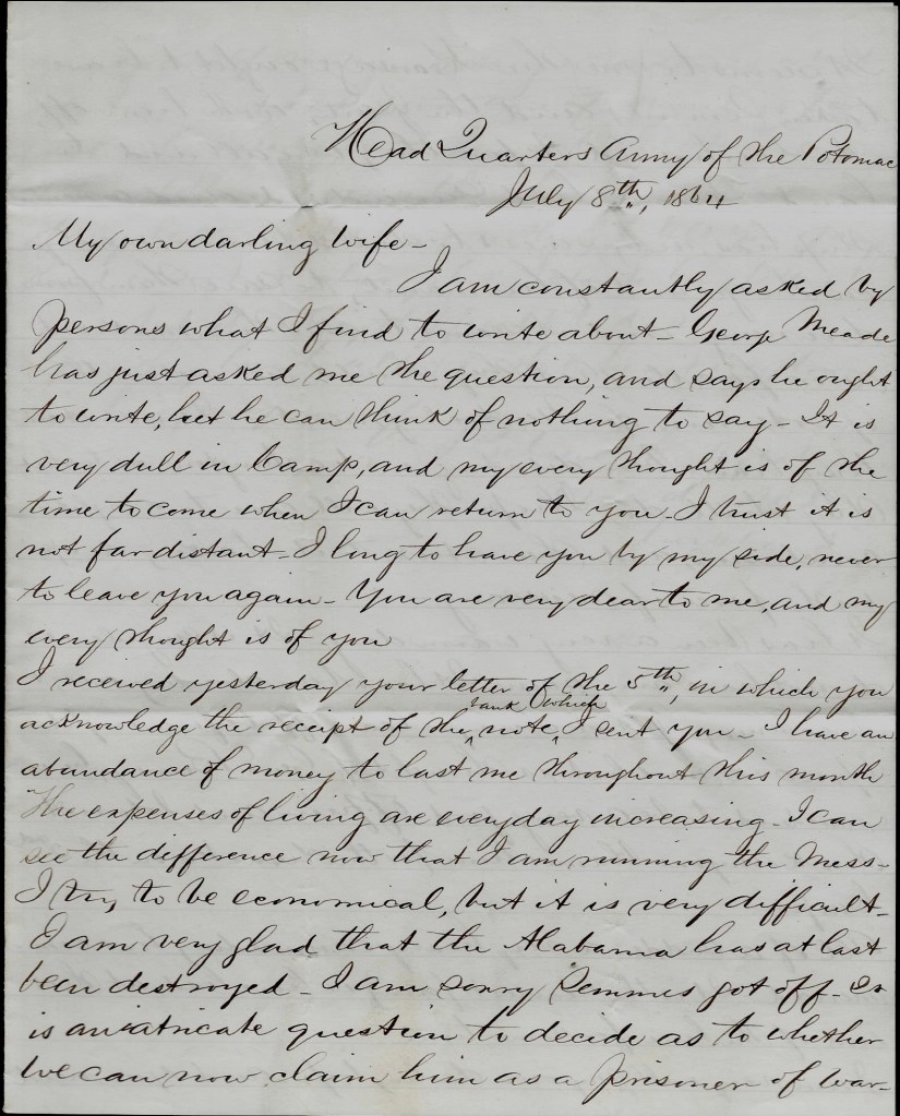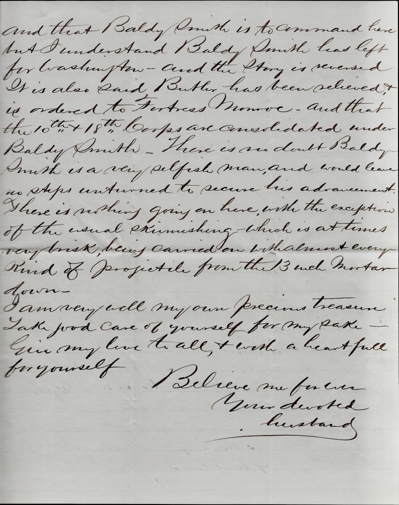 We have indeed passed through many and trying scenes since I heard from you. When I write to you last we were at Rodman’s Point near Little Washington, North Carolina. Since then we have been almost all over Virginia. First, we went to Portsmouth and from there to Bermuda Hundred—a little above City Point—and to the Battle of Drewry’s Bluff, and from there to White House and from there to the Battle of Cold Harbor and from there back to White House and back to Bermuda Hundred, and from there to Petersburg where we are now and are likely to be for all that I know.