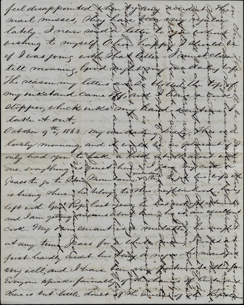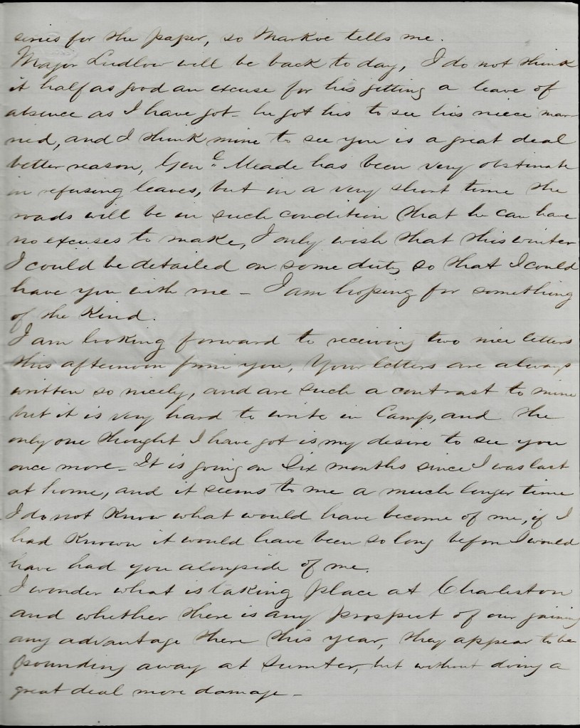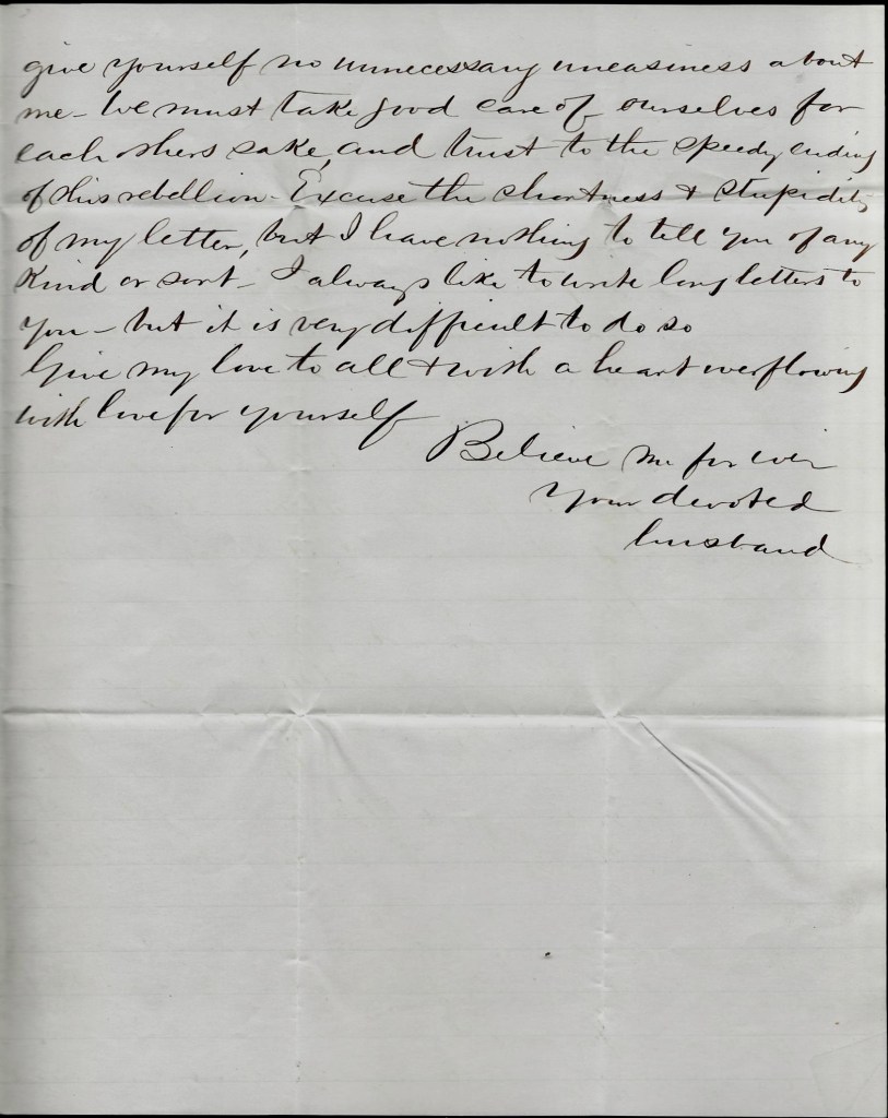 I see by Edgar’s letter that he is afraid that I shall reenlist but he need not fear. He says that he has done the best that he could to help you and is willing to still do so if I will not reenlist but if I do, he can not help me any longer. Quite an encouragement for me. Does he think that I crave this suffering and privation? Is it for me alone or is it for my children that I have suffered and still you know nothing. I have never told you one tenth part of what I have undergone, but still I do not murmur. But Edgar has come to the conclusion not to help me any longer if I reenlist. But that would not make any difference. Has the forgotten the months and years that I and you have toiled for him and what I am still although hundreds of miles from home. Tell him that I shall not reenlist but if I thought it my duty, whether he refused to help me or not, it would make no difference. Now he can do as he pleases about helping you any longer.