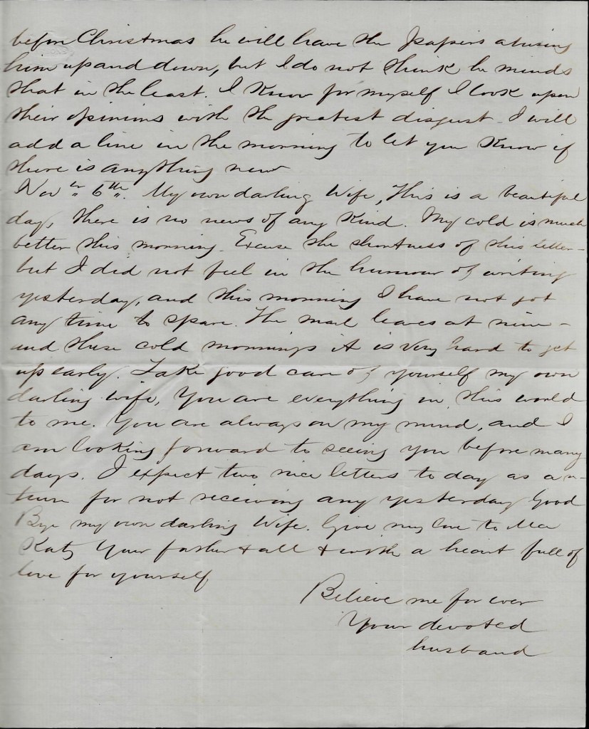 Now about Sherman and Thomas. I have seen the account in the paper [that] you say is glorious news. Well, I guess it is to every poor soldier in the field. Now you ask if I think Grant is going to fight anymore this winter. I think if he can gain anything by fighting, he will fight. And if he can do better by not fighting, he will lie still. This is all that I can tell you about him. This is my opinion.