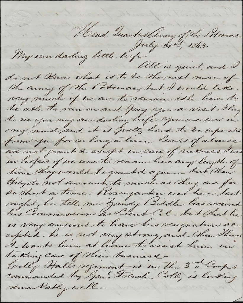 Homer’s letter contains an incredible account of the Battle of the Crater fought on July 30, 1864. In his letter, Homer informs his sister of his injuries, his treatment, and recalls some of the details of the fighting that he witnessed before being taken from the field with a head wound. See also: “Refusing Capture: Capt. Theodore Gregg, Co. F, 45th Pennsylvania” by Tim Talbott.