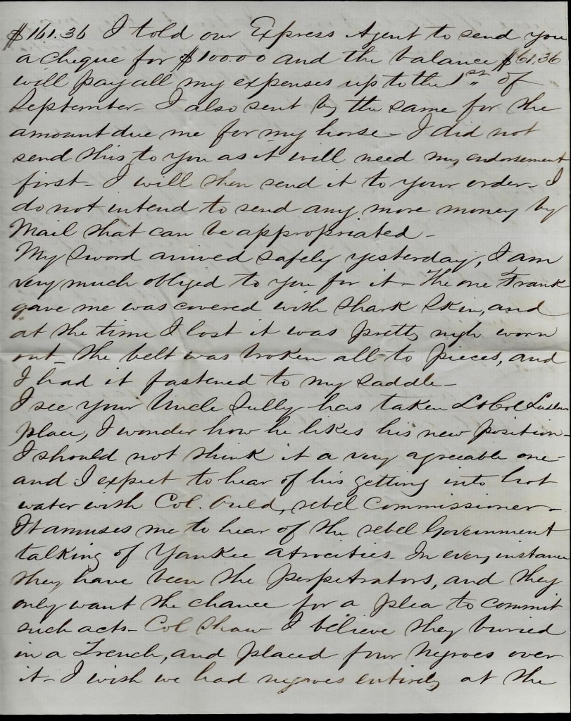Your kind epistle arrived safely this morning & a package of papers. The letter was dated the 25th & I was very glad to hear that all at home were well. I saw Mr. Mills—the one we boys use to call Monkey Mills that use to be in Mr. Johnson’s store and was in our church choir. He is well. He wished to be remembered to Father…I received the handkerchiefs & stamps a few days ago.