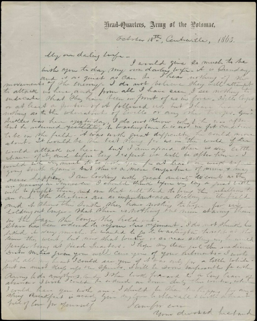 I have just received yours & Colby’s letters of the 14th inst. I was very anxious to hear from you as I had not heard anything since the 13th and felt quite relieved at the contents, hearing that you were so well. I think Colby’s idea with regard to our movements may be correct as we have fixed our tents & have everything arranged as if it was a permanent thing, but as I have told you, there is no telling from one minute to another where we may be.