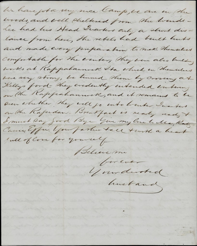 I must tell the boys that I have received letters—one from each of them, I was glad that Edgar has concluded to take up with my advice about drilling with the rest of them for they will tel him anything to get him fast. Then he cannot get away. Tell Fred to mind and not get hurt with his rifle and tell him to tell me how much he has caught in his snares this fall.