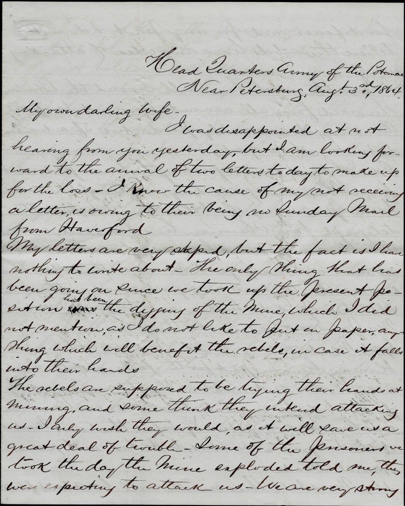 Henry’s first letter, dated, 23 August, 1864, gives a good description of the Battle of the Crater that took place on 30 July 1864.
