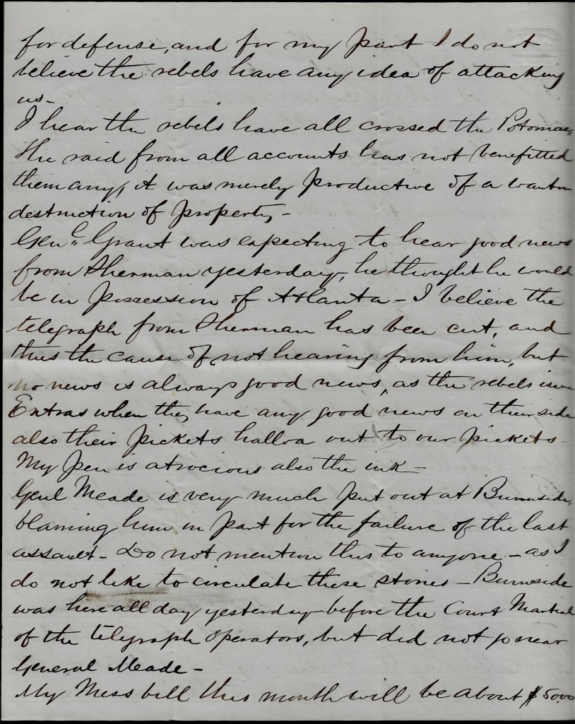 At the same time, in front of Burnside’s Corps, the niggers made a charge & were successful first but afterward were driven back & a great many of them were captured which the rebels are making build up the forts which we blew up or if they refuse, kill them. That is the report here. They use mortar for dropping shell in the trenches here now which are not very pleasant. They sound just like a locomotive coming & in the night you can see them come.