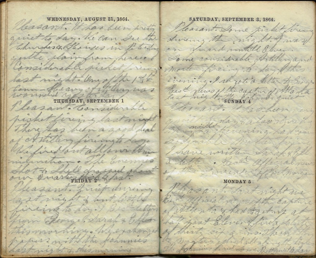 We have been here in sight of the City of Petersburg over two months now. We have been in the pits a good share of the time. We have to be up a good deal nights and sometimes all night, but we have stood it through—some of us. There is many a poor soldier that started with us on this campaign that is now sleeping beneath the sod or lying wounded in hospitals. Oh! how thankful all of us might be that while others are being called from this to another world, that we are still permitted to live and enjoy health and strength.