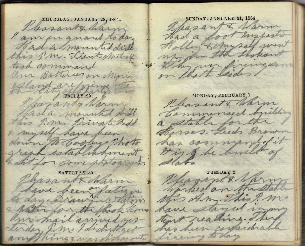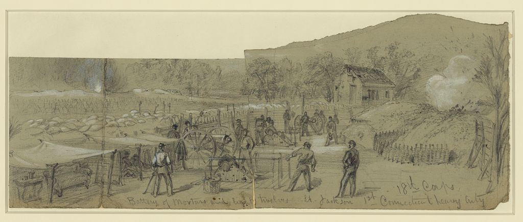 Now you want to know if I am in the same place. We are, and it is a bad place. The rebs try their guns and mortars almost every fay. Tuesday afternoon they began about 5 o’clock and kept it up for about an hour and a half. In that time they threw one hundred and five shells such as we call dinner pots. They are eight-inch shells. They did not hurt anyone in our regiment but killed one man in the 48th Pennsylvania Regt. They are in the same fort with us. But I do not think the fun was all on the Johnnies’ side for we threw more than three to their one.