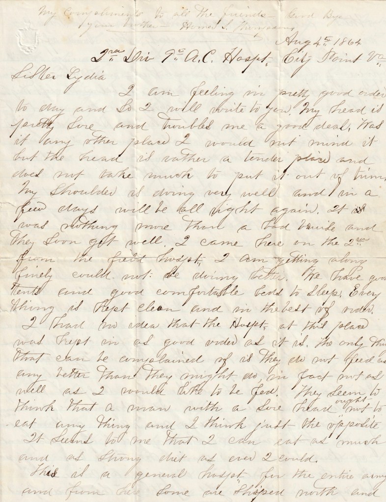 I am feeling in pretty good order today and so I will write to you. My head is pretty sore and troubles me a good deal. Was it any other place, I would not mind it but the head is rather a tender place and does not take much to put it out of trim. My shoulder is doing very well and in a few days will be all right again. It was nothing more than a bad bruise and they soon get well. I came here on the 2nd from the field hospital. I am getting along finely. Could not be doing better. We have god tents and good comfortable beds to sleep. Everything is kept clean and in the best of order. I had no idea that the hospital of this place was kept in as good order as it is. The only thing that can be complained of is they do not feed us any better than they might do. In fact, not as well as I would like to be fed. They seem to think that a man with a sore head ought not to eat anything and I think just the opposite. It seems to me that I can eat as much and as strong diet as ever I could.