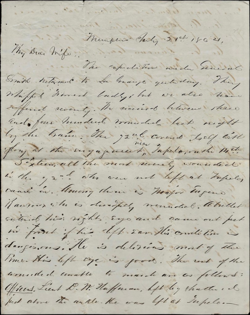 The sick, wounded and crippled are all around us. War is a horrible thing. I had intended to close my letter with this page but as I have just heard a rumor that we are to go to Memphis soon, I will fill up the fourth page.Our regiment is in most miserable condition to meet the enemy. Poorly supplied with poor guns and many of them unfit for us. God have mercy on us if we have to go into battle in our present condition.