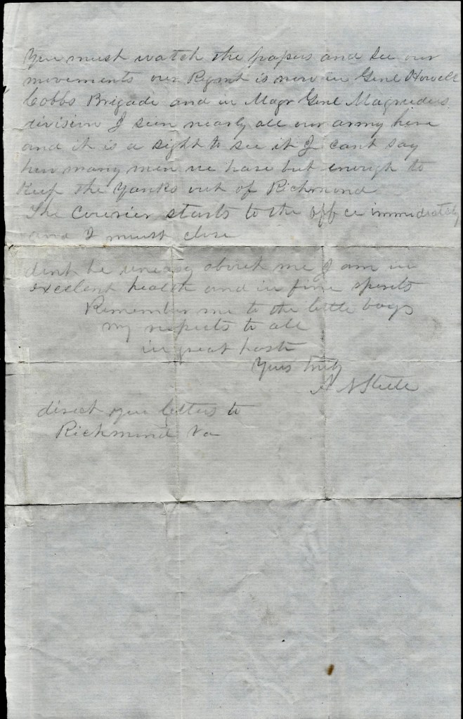 Gen. Grant works on Gen. McClellan’s plan—fortifies every inch as he takes it. The base of supplies I believe is now the White House [Landing]. I received a letter of May 20th. Please give our dear mother bushels of love from Heyward and give the same to Father and Carrie & accept the same for yourself. Please excuse my dirty paper. It dropped in the creek & my hands being dirty helped to soil it.