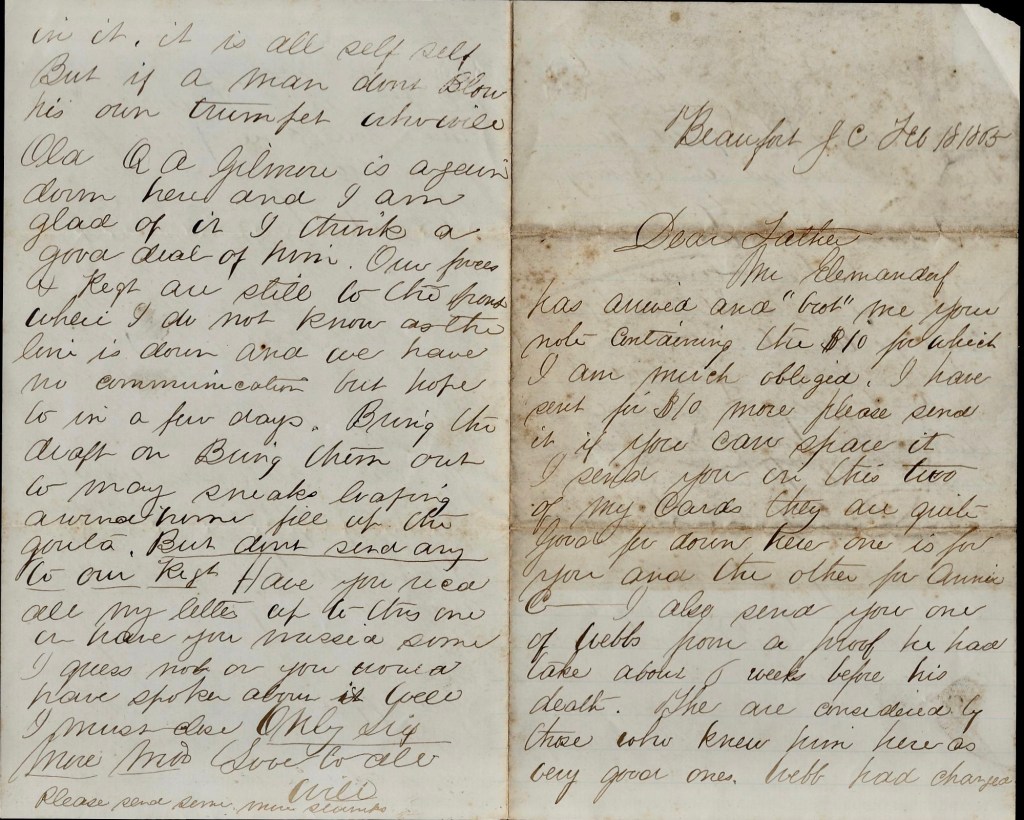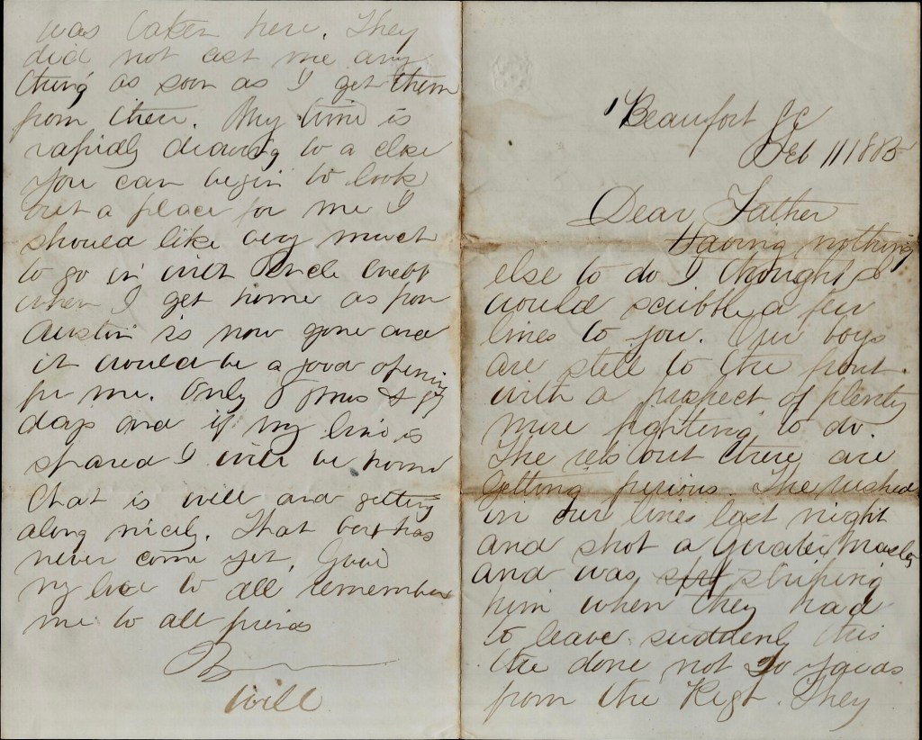 Your very kind, welcome letter was received last Thursday (the 25th) with the greatest of pleasure, and I take the earliest opportunity to reply. I hope you will pardon me for not writing you long ere this in answer to the one you sent me. I suppose I could give excuses without number but that would be useless. I will endeavor to be more prompt inn answering your letters in future. I don’t know as I have any news of importance to write. We still remain here encamped in Beaufort. Our regiment has been on outpost duty about twelve miles from here for ten days. We returned one week ago last Sunday. The regiment is drilling every day on field movements &c. and firing and getting ready for battle “generally”—if it ever comes. I don’t think there will be much of any move down this way until we have reinforcements. When they do get ready to move, I think our regiment will be ready if any will. It is second to none on this island for efficiency in drill, &c. Gen. Brannan of this place speaks highly of it, and by the way, he is a very good general. Gen. O. M. Mitchell, the new commander of the “Department of the South,” is thought a great deal of. We think when he gets something to do with, there will be something done down this way.