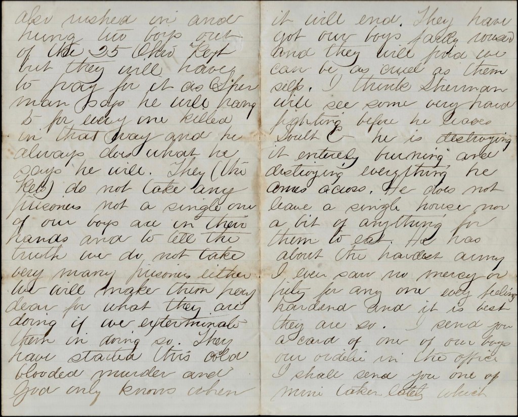 Tell Henry I should like very much to have a letter from him and have his opinion of the war. But I have not time to write much more at present. I will write again as soon as I can and will try to do better. Please excuse everything for I have written in a great hurry. Give my love to all & especially to yourself & Emma. Write just as often as you can. In haste. From your cousin, — Albert