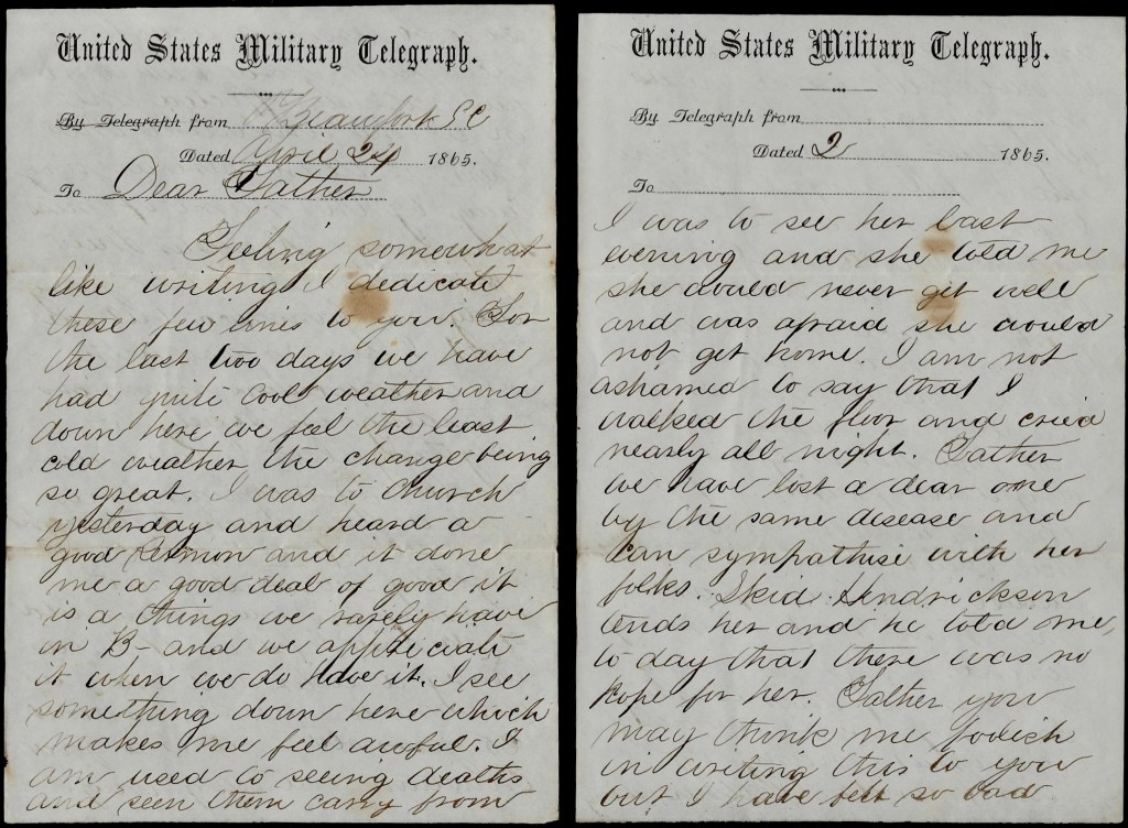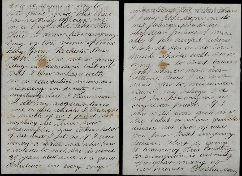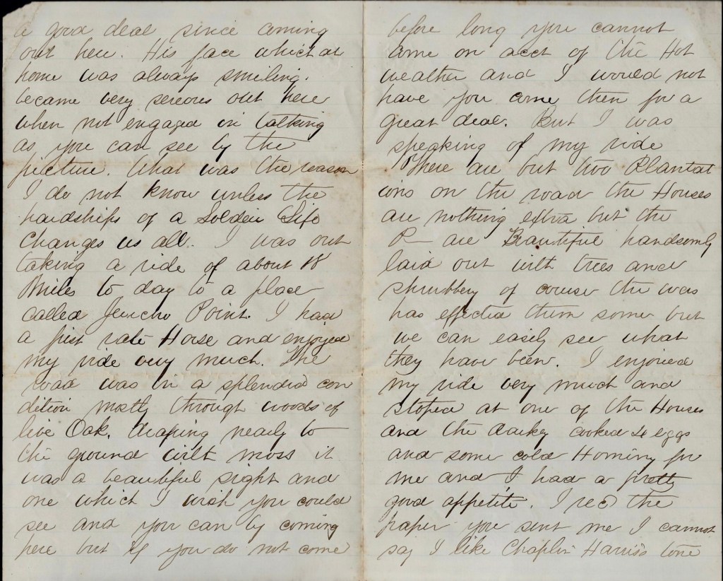 If I could have my choice I think I should prefer to live in the New England states than any country that I have seen since I left Putnam. I have not seen anything very enchanting yet in “Dixie’s Land” except “contrabands.” I think some of taking one home with me if the Putnam girls don’t write me a line once in a while.