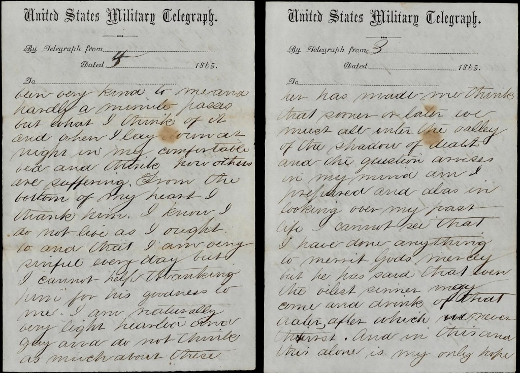 Please tell Amey, Ann, Lizzie, yourself and everybody else that when they write me a letter and happen to blot it a little, I shall not excuse them for not sending them. “Cause why?” We don’t mind blots in the army. If I should send a letter free from blots &c., I fear you would be obliged to wait some time before you received any. I hope, however, you will excuse the blots. I certainly will. But I must close for it is getting late. I will write as often as I can and you must do the same. Oh! by the way, I receive papers from you almost every mail and if it is not too much trouble, I hope you will keep sending them for they are very acceptable and I thank you a thousand times for them. My love to all—yourself included. Goodbye for the present. — Albert